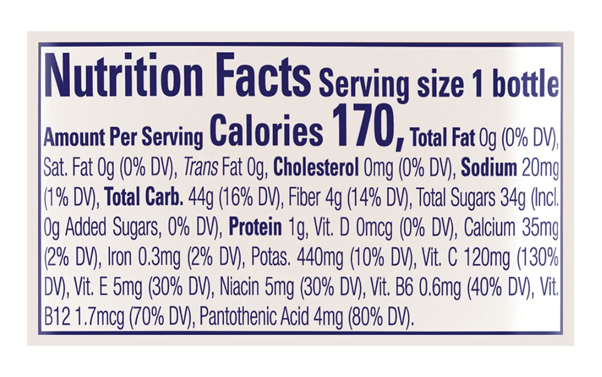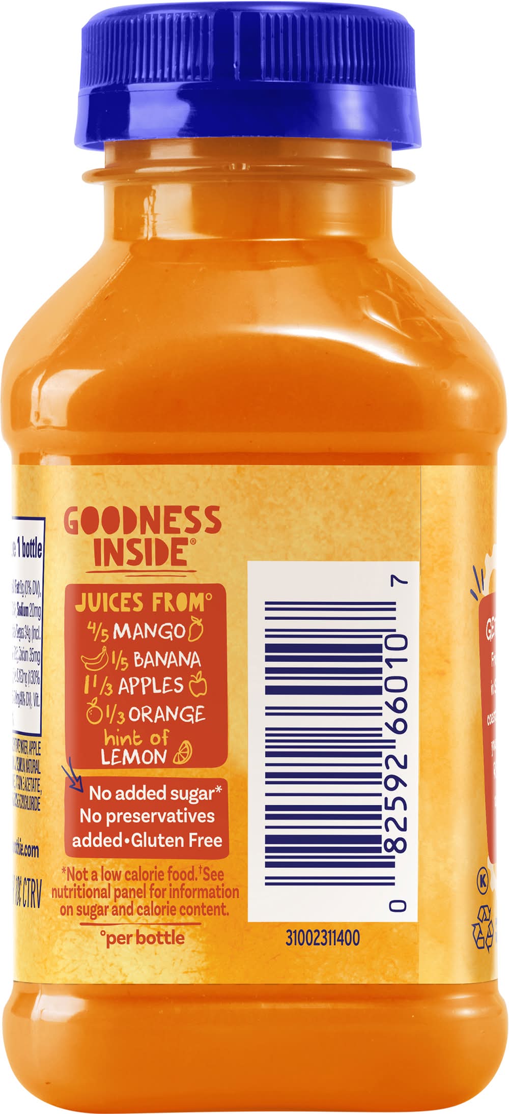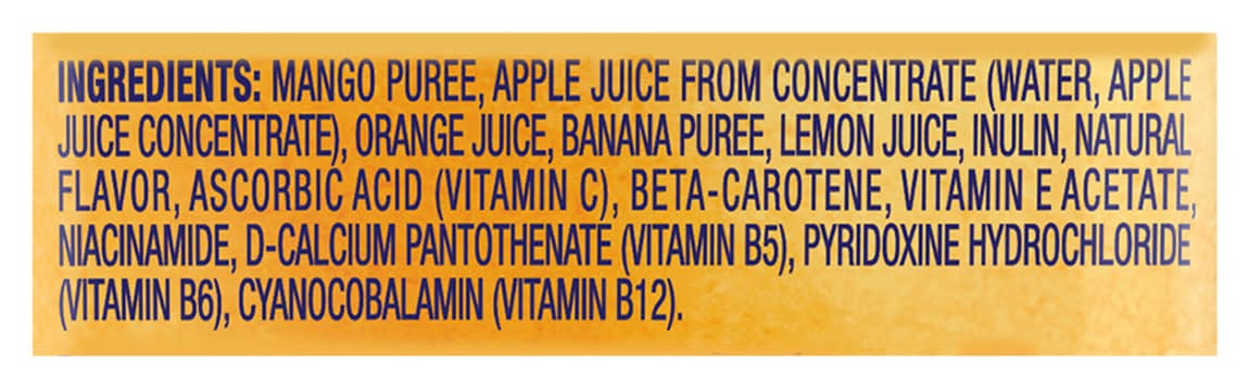 Ingredients: Mango Puree, Apple Juice from Concentrate (Water, Apple Juice Concentrate), Orange Juice, Banana Puree, Lemon Juice, Inulin, Natural Flavor, Ascorbic Acid (Vitamin C), Beta-Carotene, Vitamin E Acetate, Niacinamide, D-Calcium Pantothenate (Vitamin B5), Pyridoxine Hydrochloride (Vitamin B6), Cyanocobalamin (Vitamin B12)