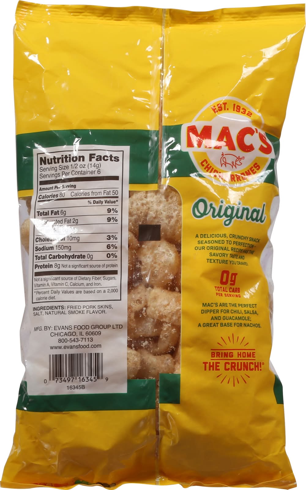 Pork Skins, Fried, Original • Size: 3 OZ • Evans Food Group Ltd, Chicago, IL, 60609