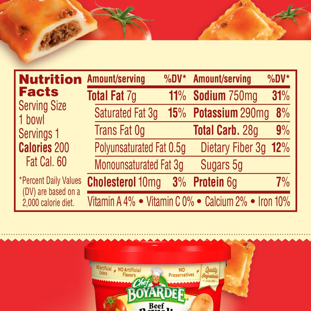 These ravioli are packed with beef and covered in hearty tomato and meat sauce for a quick and easy pasta meal the whole family can enjoy. Pasta contains no artificial flavors, colors, or preservatives. The microwavable bowl makes it easy to create a quick pasta meal in minutes. With 6 g protein and 0 g trans fat per serving, Beef Ravioli is perfect for a flavorful dinner or tasty after-school snack. From pizza sauce to spaghetti, ravioli, and lasagna. • Flavor: Beef ravioli • Size: 7.5 OZ • Conagra Brands, P.O. Box 3534, Chicago, IL, 60654