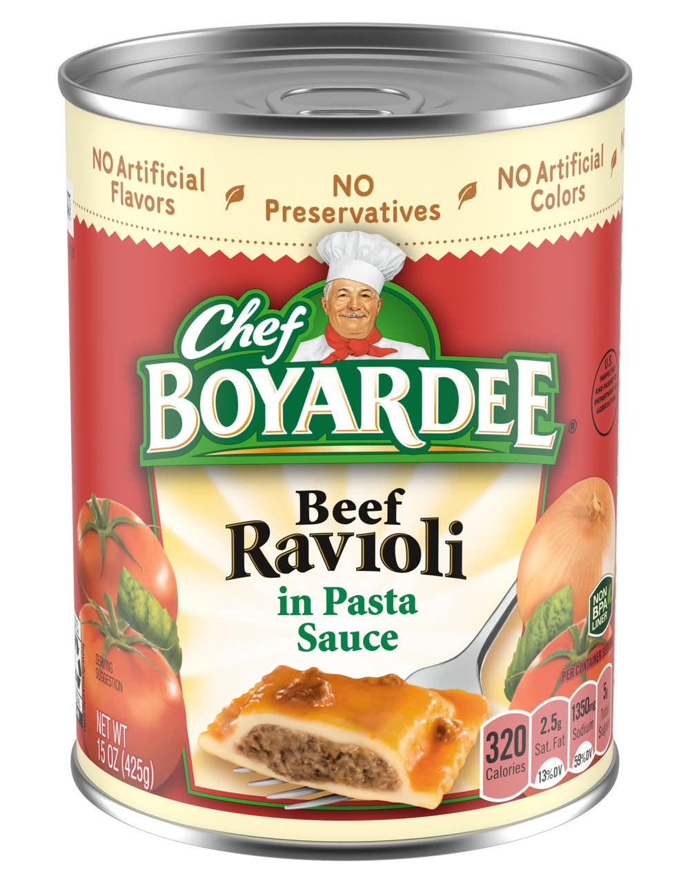 Chef Boyardee Beef Ravioli is a delicious and convenient prepared meal that is ready to eat in minutes and has delighted families for generations. Made with tasty beef ravioli pasta smothered in rich, Italian flavored pasta sauce, this canned food has the timeless flavor everyone loves. Made with no artificial flavors, colors or preservatives, this iconic pantry staple makes a wholesome meal for kids of ALL ages. When you need a quick stove top or microwave meal, grab a can of beef ravioli pasta and in just a few minutes, dinner is ready to serve. Perfect for office or school lunches, easy dinners, or quick and filling snacks, Chef Boyardee ravioli provides that time tested taste your family loves. • Size: 15 OZ • Packaging: Reusable