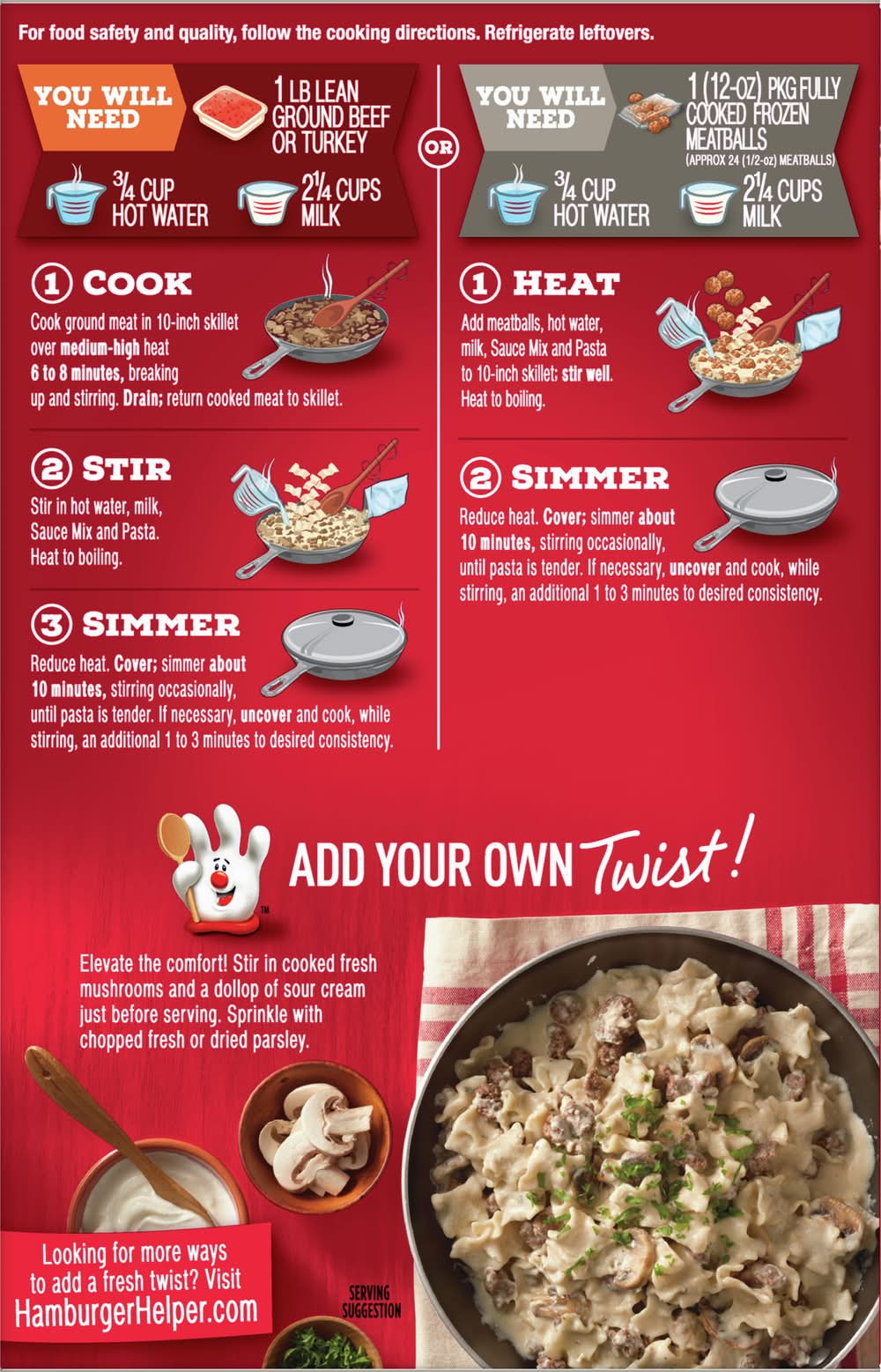Directions for use: For food safety and quality, follow the cooking directions. Refrigerate leftovers. You Will Need: 1 lb lean ground beef or turkey; 3/4 cup hot water; 2-1/4 cups milk. 1. Cook: Cook ground meat in 10-Inch skillet over medium-high heat 6 to 8 minutes, breaking up and stirring. Drain; Return cooked meal to skillet. 2. Stir: Stir in hot water, milk, Sauce Mix and Pasta. Heat to boiling. 3. Simmer: Reduce heat. Cover; simmer about 10 minutes, stirring occasionally, until pasta is tender. If necessary, uncover and cook, while stirring, an additional 1 to 3 minutes to desired consistency. Or. You will need: 1 (12-oz) pkg fully cooked frozen meatballs (approx 24 (1/2-oz) meatballs). 3/4 cup hot water. 2-1/4 cups milk. 1. Heat: Add meatballs, hot water, milk, sauce mix and pasta lo 10-inch skillet: Slit well. Heat to boiling. 2. Simmer: Reduce heat. Cover; simmer about 10 minutes, stiffing occasionally, until pasta is tender. If necessary, uncover and cook, while stirring, an additional 1 lo 3 minutes lo desired consistency. Try with meatballs instead of ground beef. Add your own twist! Elevate the comfort! Stir in cooked fresh mushrooms and a dollop of sour cream just before serving. Sprinkle with chopped fresh or dried parsley. Storage recommendation: