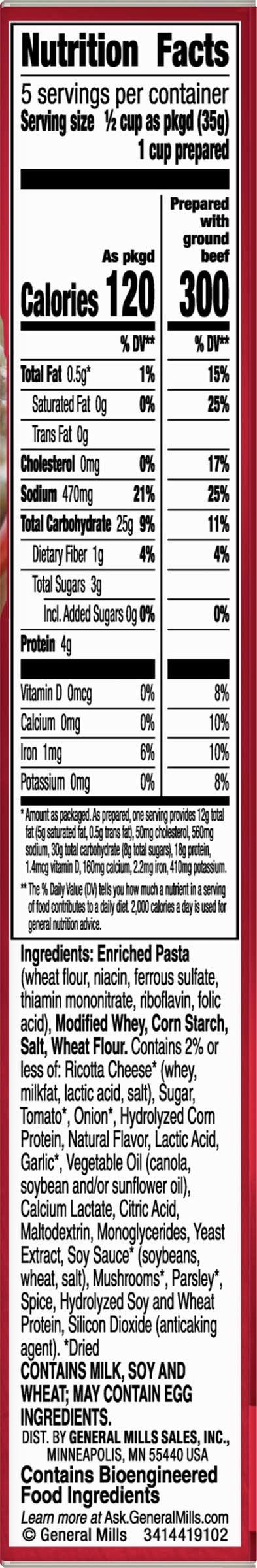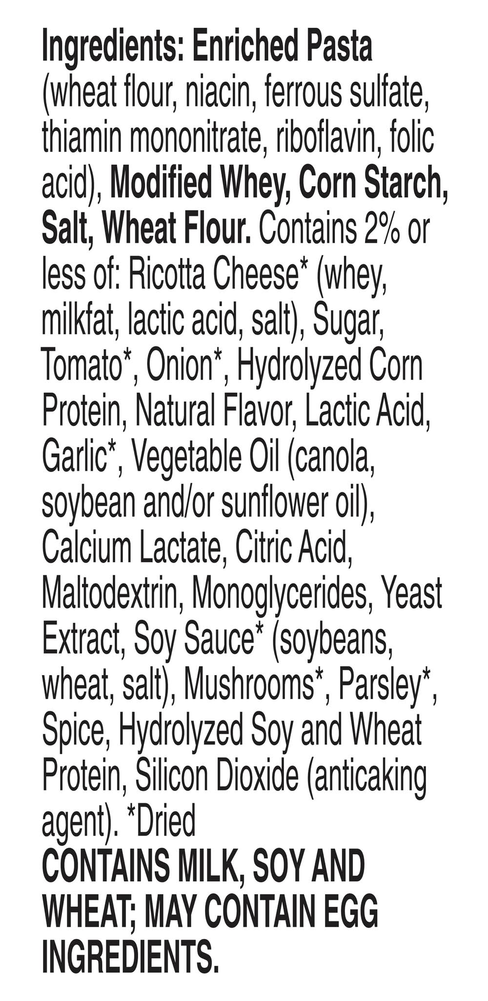 Ingredients: Enriched Pasta (Wheat Flour, Niacin, Ferrous Sulfate, Thiamin Mononitrate, Riboflavin, Folic Acid), Modified Whey, Corn Starch, Salt, Wheat Flour. Contains 2% or Less of: Ricotta Cheese (Dried) (Whey, Milkfat, Lactic Acid, Salt), Sugar, Tomato (Dried), Onion (Dried), Hydrolyzed Corn Protein, Natural Flavor, Lactic Acid, Garlic (Dried), Vegetable Oil (Canola, Soybean and/or Sunflower Oil), Calcium Lactate, Citric Acid, Maltodextrin, Monoglycerides, Yeast Extract, Soy Sauce (Dried), (Soybeans, Wheat, Salt), Mushrooms (Dried), Parsley (Dried), Spice, Hydrolyzed Soy and Wheat Protein, Silicon Dioxide (Anticaking Agent). Contains: Milk, Soybeans, Wheat, Corn, Eggs