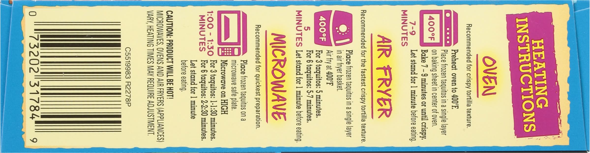 Directions for use: Directions: Heating Instructions: Oven: Recommended for crispy tortilla texture. Preheat oven to 400 degrees F. Place frozen taquitos in a single layer on baking sheet in center of oven. Bake 7-9 minutes or until crispy. Let stand for 1 minute before eating. Air fryer: Recommended for the fastest crispy tortilla texture. Place frozen taquitos in a single layer in air fryer basket. Air fry at 400 degrees F For 3 taquitos: 5 minutes. For 6 taquitos: 5-7 minutes. Let stand for 1 minute before eating. Microwave: recommended for quickest preparation. Place frozen taquitos on a microwave safe plate. Microwave on high For 3 taquitos: 1-1:30 minutes. For 6 taquitos: 2-2:30 minutes. Let stand for 1 minute before eating. Caution: product will be hot! Microwaves, ovens and air fryers (appliances) vary, heating times may require adjustment. Keep frozen. Storage recommendation: Keep frozen.