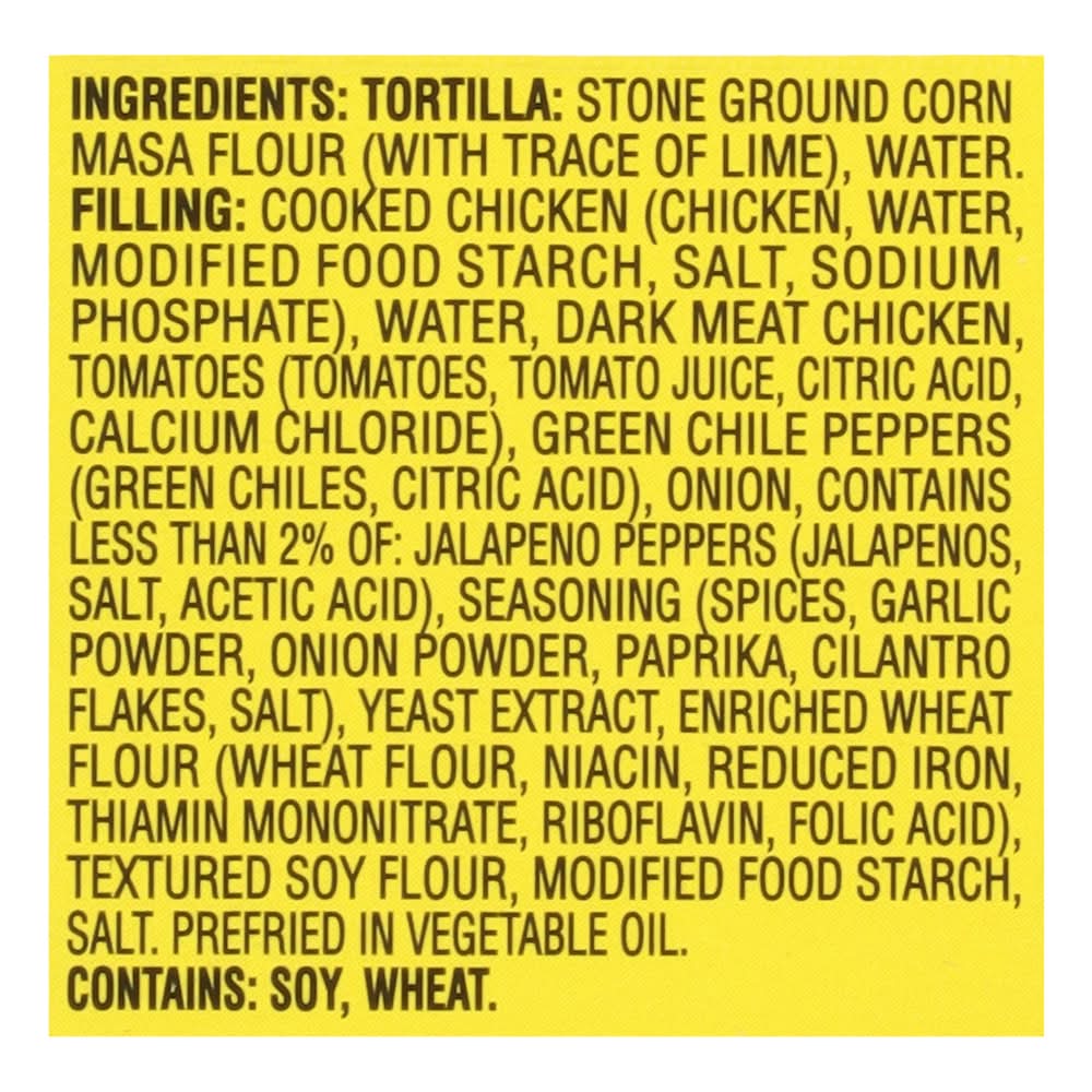 Ingredients: Tortilla: Stone Ground Corn Masa Flour (with Trace of Lime), Water, Filling: Cooked Chicken (Chicken, Water, Modified Food Starch, Salt, Sodium Phosphate), Water, Dark Meat Chicken, Tomatoes (Tomatoes, Tomato Juice, Citric Acid, Calcium Chloride), Green Chile Peppers (Green Chiles, Citric Acid), Onion, Contains Less than 2% of: Jalapeno Peppers (Jalapenos, Salt, Acetic Acid), Seasoning (Spices, Garlic Powder, Onion Powder, Paprika, Cilantro Flakes, Salt), Yeast Extract, Enriched Wheat Flour (Wheat Flour, Niacin, Reduced Iron, Thiamin Mononitrate, Riboflavin, Folic Acid), Textured Soy Flour, Modified Food Starch, Salt, Prefried in Vegetable Oil Contains: Soybeans, Wheat, Corn