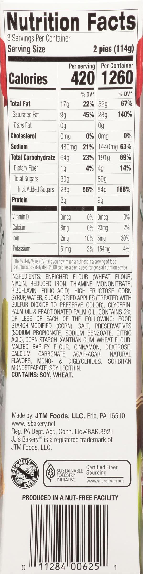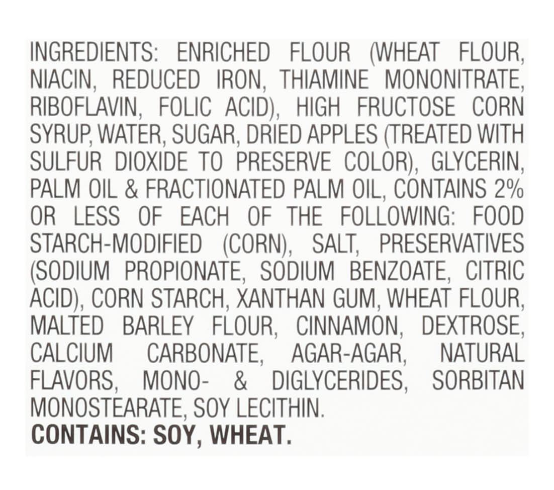 Ingredients: Enriched Flour (Wheat Flour, Niacin, Reduced Iron, Thiamine Mononitrate, Riboflavin, Folic Acid), High Fructose Corn Syrup, Water, Sugar, Dried Apples (Treated with Sulfur Dioxide to Preserve Color), Glycerin, Palm Oil & Fractionated Palm Oil, Contains 2% or Less of Each of the Following: Food Starch-Modified (Corn), Salt, Preservatives (Sodium Propionate, Sodium Benzoate, Citric Acid), Corn Starch, Xanthan Gum, Wheat Flour, Malted Barley Flour, Cinnamon, Dextrose, Calcium Carbonate, Agar-Agar, Natural Flavors, Mono- & Diglycerides, Sorbitan Monostearate, Soy Lecithin Contains: 'Contains Soybeans', 'Contains Wheat'