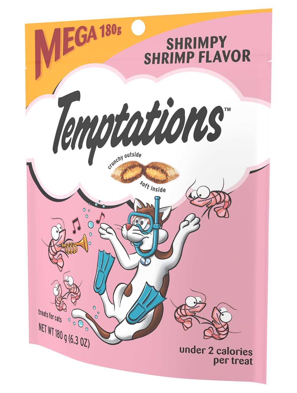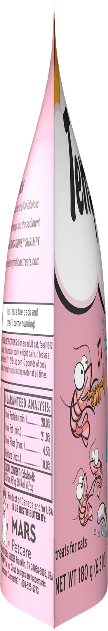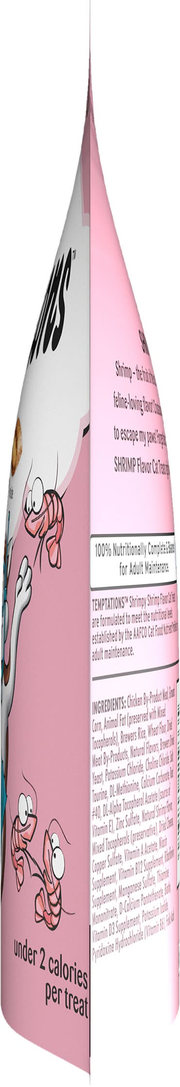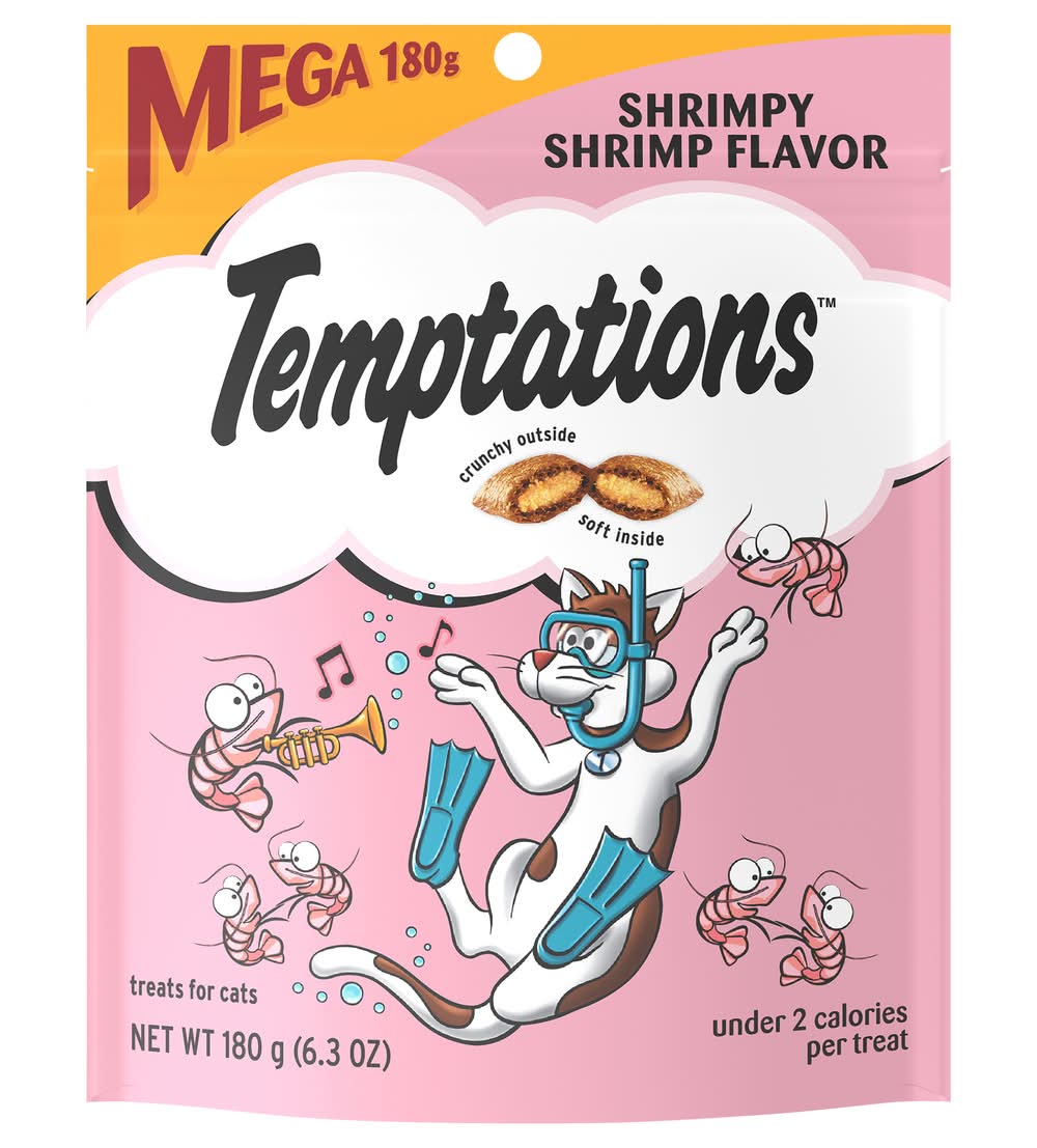 Under 2 calories per treat. Crunchy outside. Soft inside. Shrimp - the fruit of the sea. They may be small in size, but they’re full of fabulous feline-loving flavor! Crustaceans beware: you can’t dive far enough into the sediment to escape my paws! Forget the turf and gimme the surf with Temptations Shrimpy Shrimp Flavors Cat treat right meow! 100% nutritionally complete & balanced for adult maintenance. Just shake the pack and they’ll come running! temptationstreats.com. For more feline fun, visit temptationstreats.com. Questions or Comments? 1-800-525-5273. Waltham: A world leading authority on pet care and nutrition. Stay fresh pouch! Product of Canada and/or USA. Size: 6.3 OZ