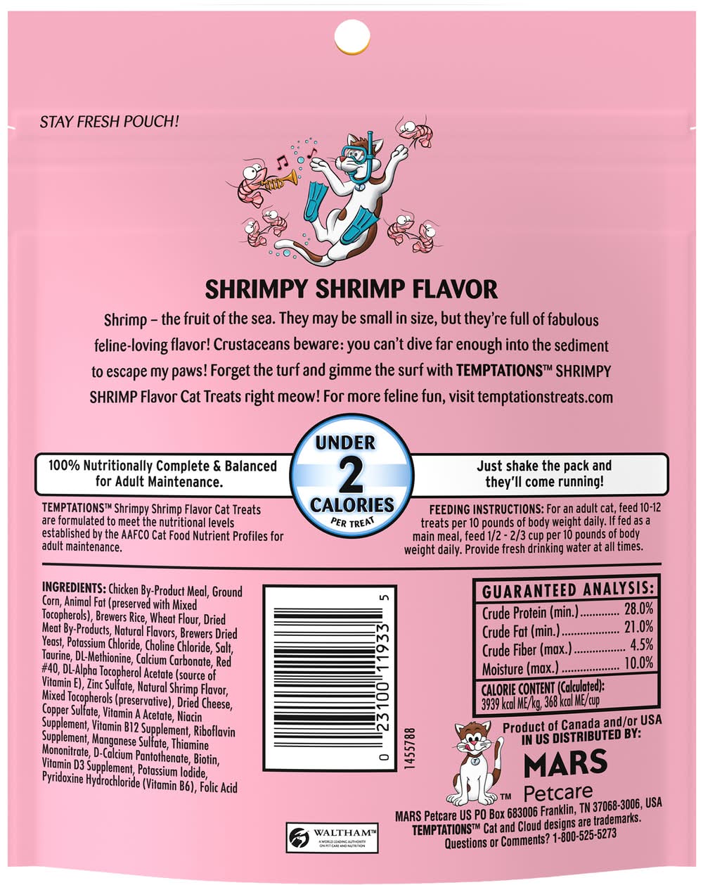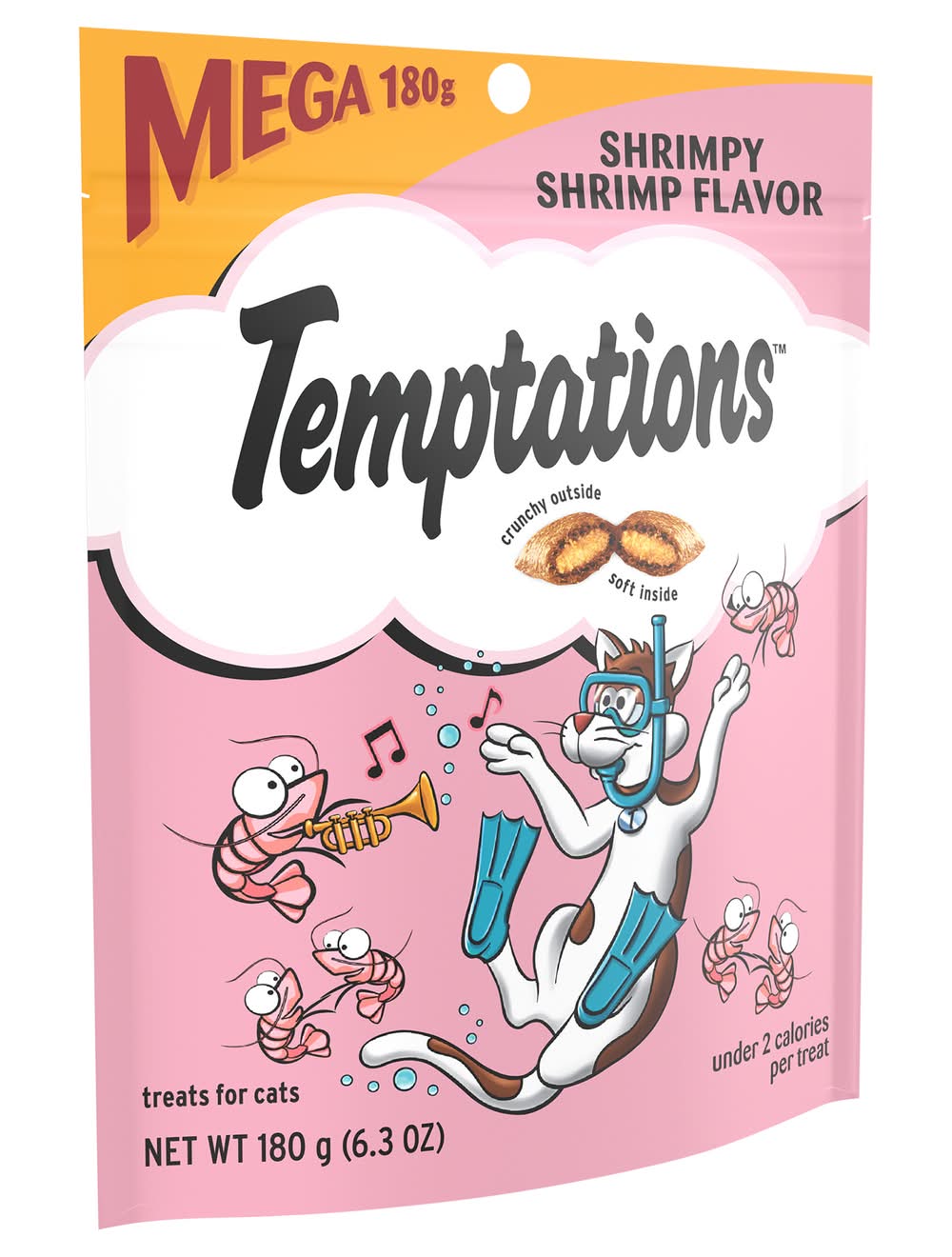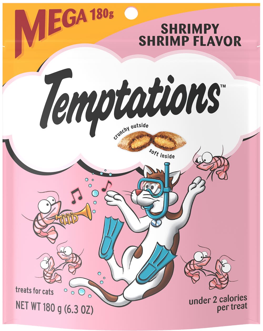 Under 2 calories per treat. Crunchy outside. Soft inside. Shrimp - the fruit of the sea. They may be small in size, but they’re full of fabulous feline-loving flavor! Crustaceans beware: you can’t dive far enough into the sediment to escape my paws! Forget the turf and gimme the surf with Temptations Shrimpy Shrimp Flavors Cat treat right meow! 100% nutritionally complete & balanced for adult maintenance. Just shake the pack and they’ll come running! temptationstreats.com. For more feline fun, visit temptationstreats.com. Questions or Comments? 1-800-525-5273. Waltham: A world leading authority on pet care and nutrition. Stay fresh pouch! Product of Canada and/or USA. Size: 6.3 OZ
