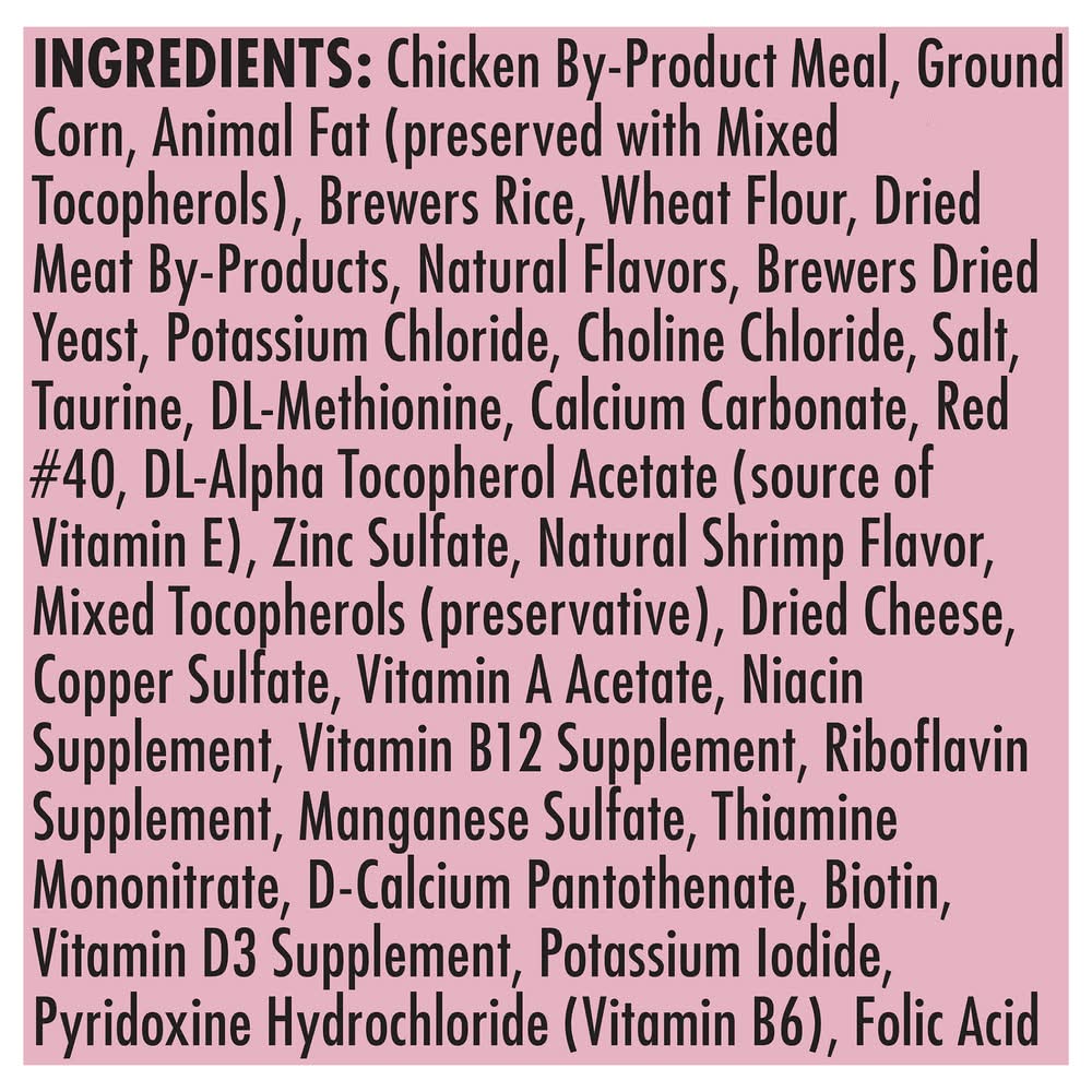 Ingredients: Chicken By-Product Meal, Ground Corn, Animal Fat (Preserved with Mixed Tocopherols), Brewers Rice, Wheat Flour, Dried Meat By-Products, Natural Flavors, Brewers Dried Yeast, Potassium Chloride, Choline Chloride, Salt, Taurine, DL-Methionine, Calcium Carbonate, Red 40, DL-Alpha Tocopherol Acetate (Source of Vitamin E), Zinc Sulfate, Natural Shrimp Flavor, Mixed Tocopherols (Preservative), Dried Cheese, Copper Sulfate, Vitamin A Acetate, Niacin Supplement, Vitamin B12 Supplement, Riboflavin Supplement, Manganese Sulfate, Thiamine Mononitrate, D-Calcium Pantothenate, Biotin, Vitamin D3 Supplement, Potassium Iodide, Pyridoxine Hydrochloride (Vitamin B6), Folic Acid
