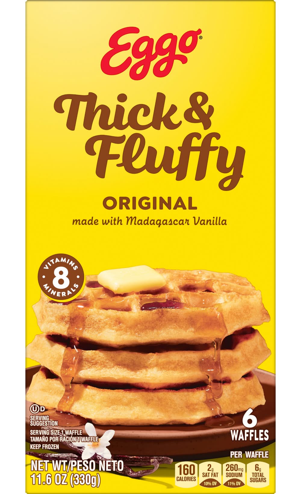 Wake up and greet the day with the feel-good taste of Thick and Fluffy waffles. Crafted with delicious ingredients, our waffles are a perfect balance of crispy, fluffy goodness. Convenient and easy to prepare, Thick and Fluffy waffles made with Madagascar vanilla bring warmth to busy mornings. With no artificial colors and flavors, our waffles also provide a good source of 8 vitamins and minerals; Great for families and individuals, these rich waffles are made to enjoy as a stand-alone breakfast treat. Try them with your favorite morning toppings like butter and syrup, jellies and preserves, and whipped cream. • Flavor: Original • Size: 11.6 OZ • Kellogg Sales, Battle Creek,MI,49016 • Packaging: Reusable