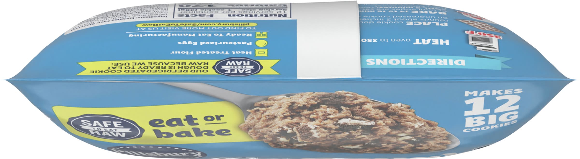 Directions for use: Directions: Heat oven to 350 degrees F. Place cookie dough rounds about 2 inches apart on ungreased cookie sheet. Bake 14 to 16 minutes or until edges are set. Cool 5 minutes, remove from cookie sheet. Note: Centers will rise while baking and flatten when cooling. Tip: If baking from frozen dough, add 3 minutes to the bake time. Keep dough refrigerated. Product can be frozen up to 2 months if placed in freezer before the use by date printed on the package. Storage recommendation: Keep dough refrigerated.