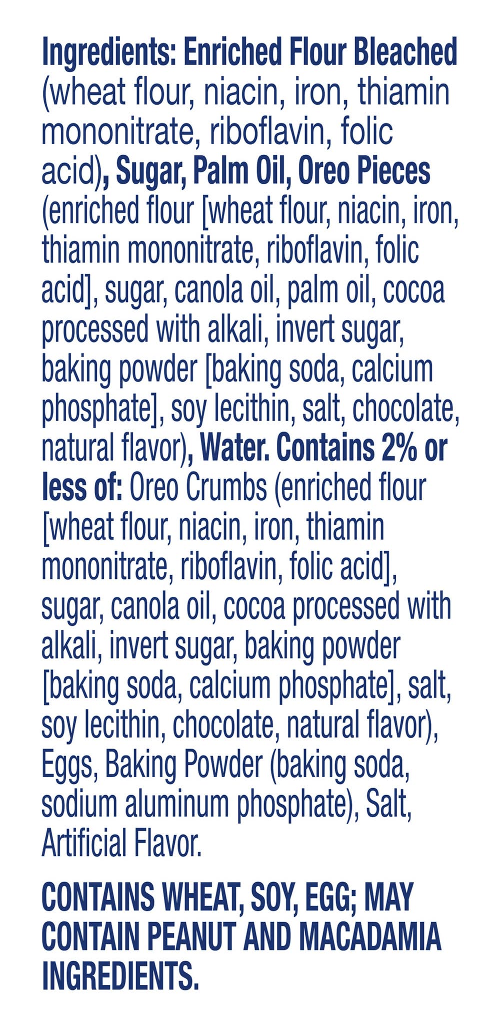 Ingredients: Enriched Flour Bleached (Wheat Flour, Niacin, Iron, Thiamin Mononitrate, Riboflavin, Folic Acid), Sugar, Palm Oil, Oreo Pieces (Enriched Flour [Wheat Flour, Niacin, Iron, Thiamin Mononitrate, Riboflavin, Folic Acid], Sugar, Canola Oil, Palm Oil, Cocoa Processed with Alkali, Invert Sugar, Baking Powder [Baking Soda, Calcium Phosphate], Soy Lecithin, Salt, Chocolate, Natural Flavor), Water. Contains 2% or Less of: Oreo Crumbs (Enriched Flour [Wheat Flour, Niacin, Iron, Thiamin Mononitrate, Riboflavin, Folic Acid], Sugar, Canola Oil, Cocoa Processed with Alkali, Invert Sugar, Baking Powder [Baking Soda, Calcium Phosphate], Salt, Soy Lecithin, Chocolate, Natural Flavor), Eggs, Baking Powder (Baking Soda, Sodium Aluminum Phosphate), Salt, Artificial Flavor Contains: Wheat, Soybeans, Eggs, Peanuts, Tree Nuts, Macadamia Nuts
