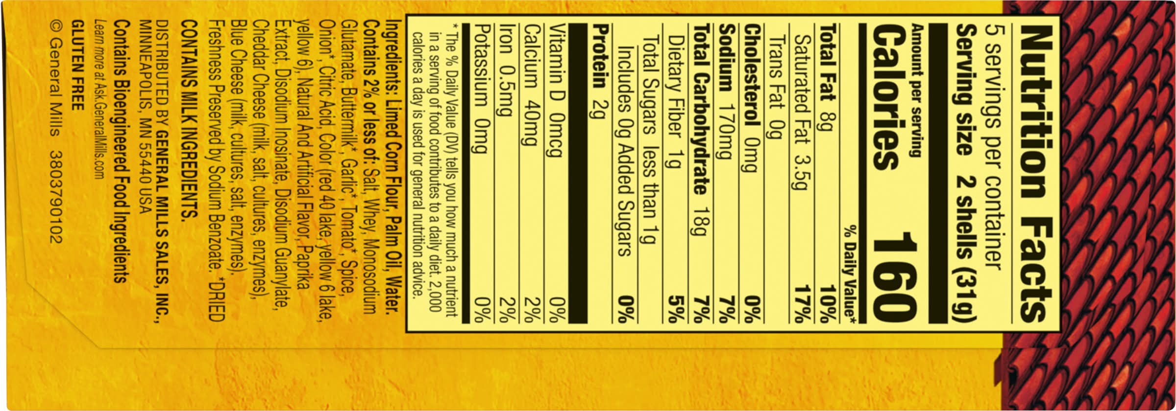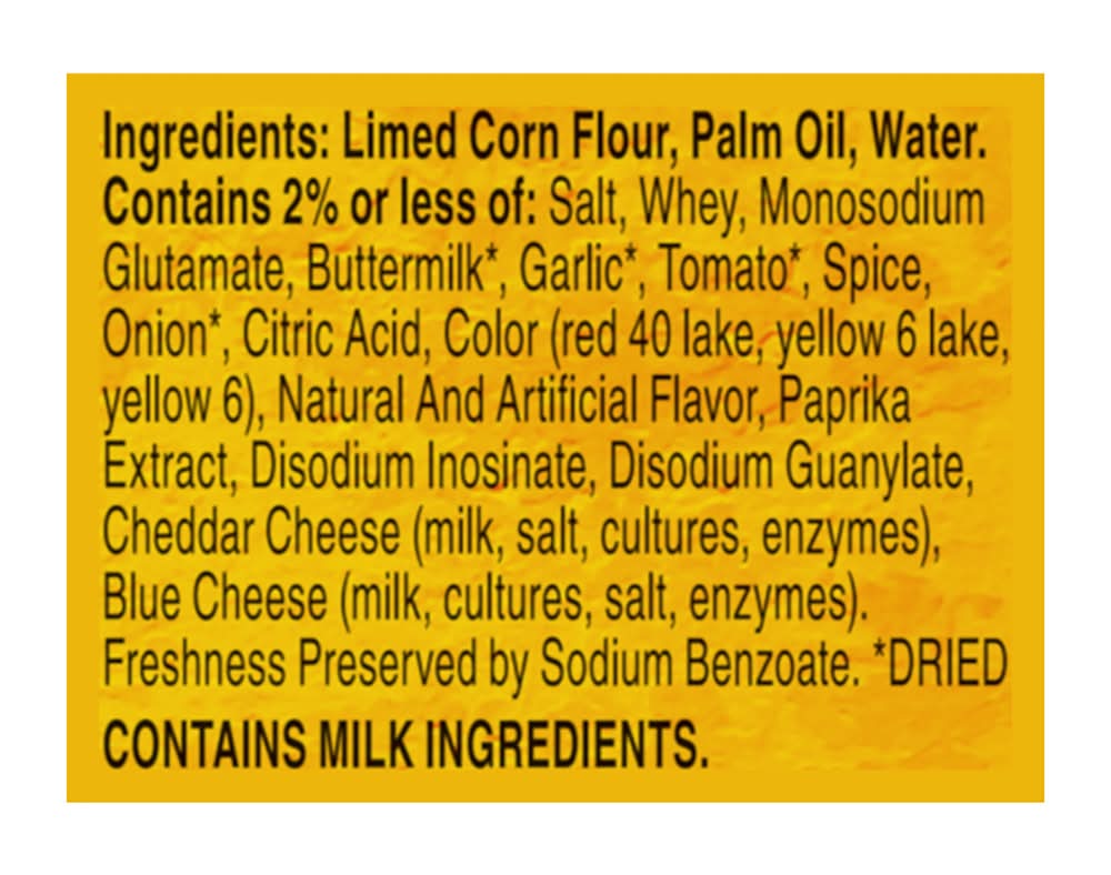 Ingredients: Limed Corn Flour, Palm Oil, Water, Contains 2% or Less of: Salt, Whey, Monosodium Glutamate, Buttermilk*, Garlic*, Tomato*, Spice, Onion*, Citric Acid, Color (Red 40 Lake, Yellow 6 Lake, Yellow 6), Natural and Artificial Flavor, Paprika Extract, Disodium Inosinate, Disodium Guanylate, Cheddar Cheese (Milk, Salt, Cultures, Enzymes), Blue Cheese (Milk, Cultures, Salt, Enzymes), Freshness Preserved by Sodium Benzoate. *Dried Contains: Milk Additives: Genetically Modified Ingredients