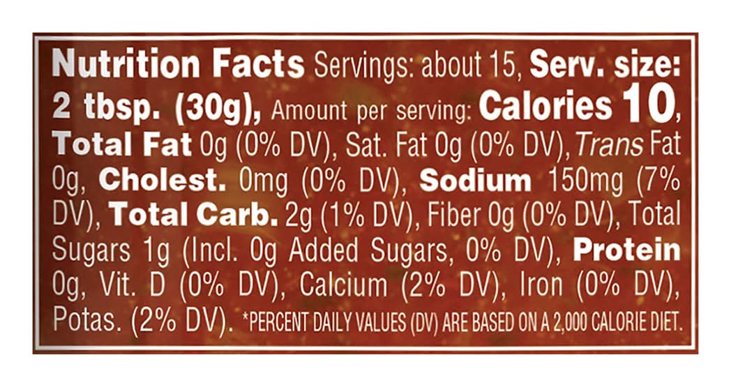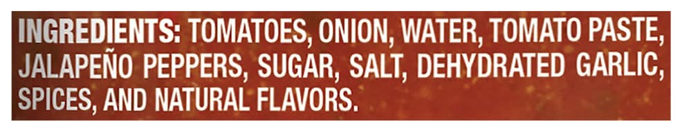 Ingredients: Tomatoes, Onion, Water, Tomato Paste, Jalapeno Peppers, Sugar, Salt, Dehydrated Garlic, Spices, and Natural Flavors