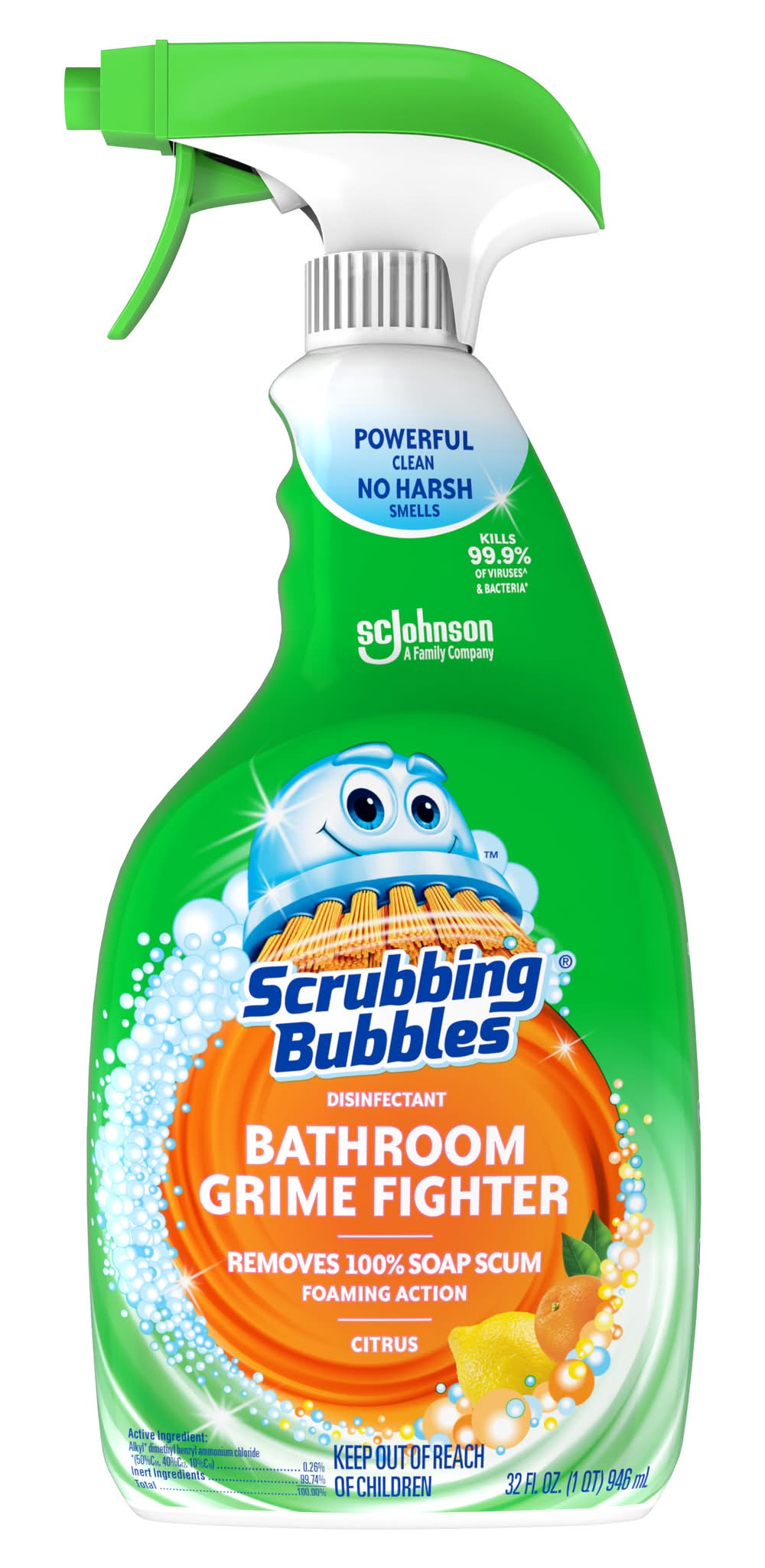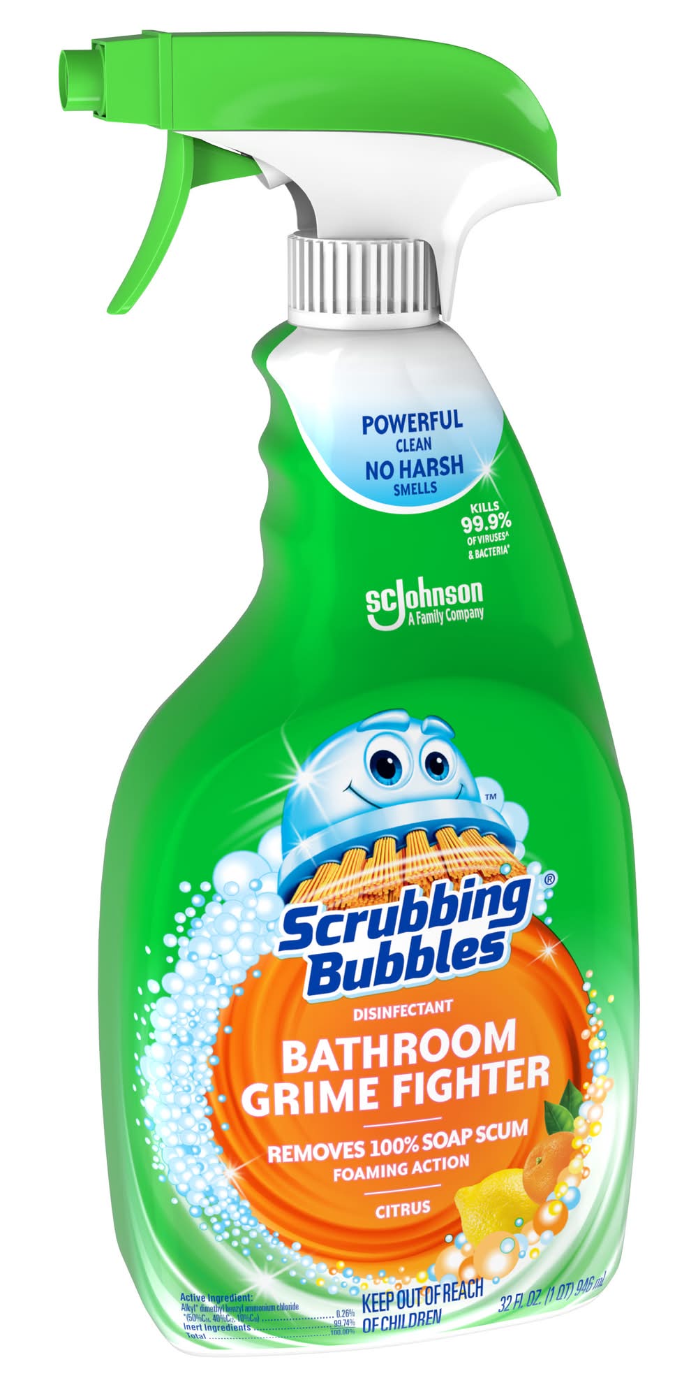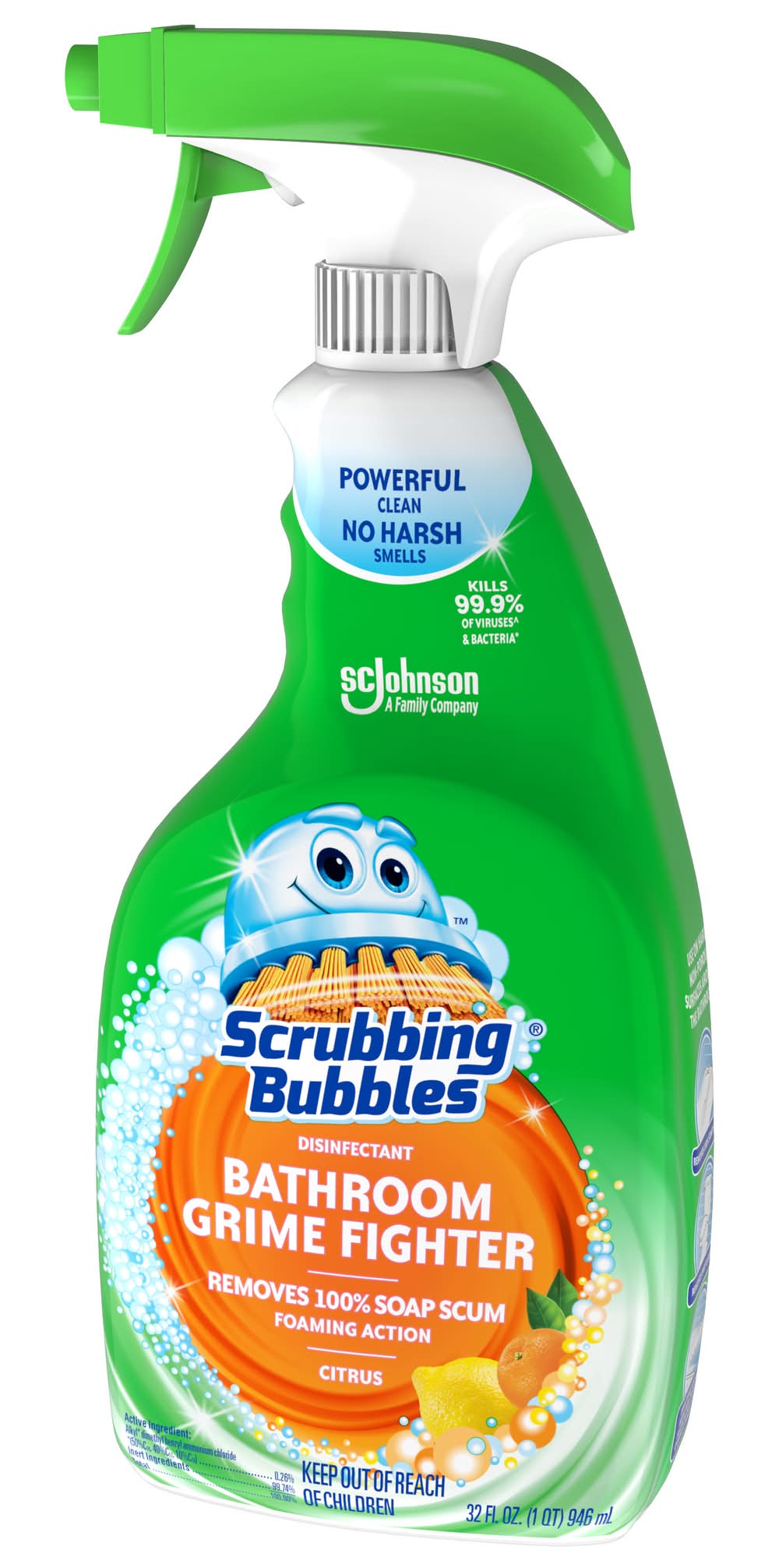 Scrubbing Bubbles Citrus Bathroom Grime Fighter Cleaner is formulated to power through tough soap scum and grime, effectively removing dirt from a variety of bathroom surfaces. It boasts a pleasant citrus fragrance and is designed to clean without leaving harsh smells behind. This product is suitable for use on tubs, shower walls, vinyl shower curtains, shower doors, sinks, countertops, vanity tops, glazed ceramic tile, stainless steel, chrome fixtures, fiberglass, vinyl, and glazed porcelain surfaces. For use on other surfaces, it is recommended to perform a spot test in an inconspicuous area. • Size: 32 OZ • S.c. johnson & son, inc., Racine,WI,53403-2236