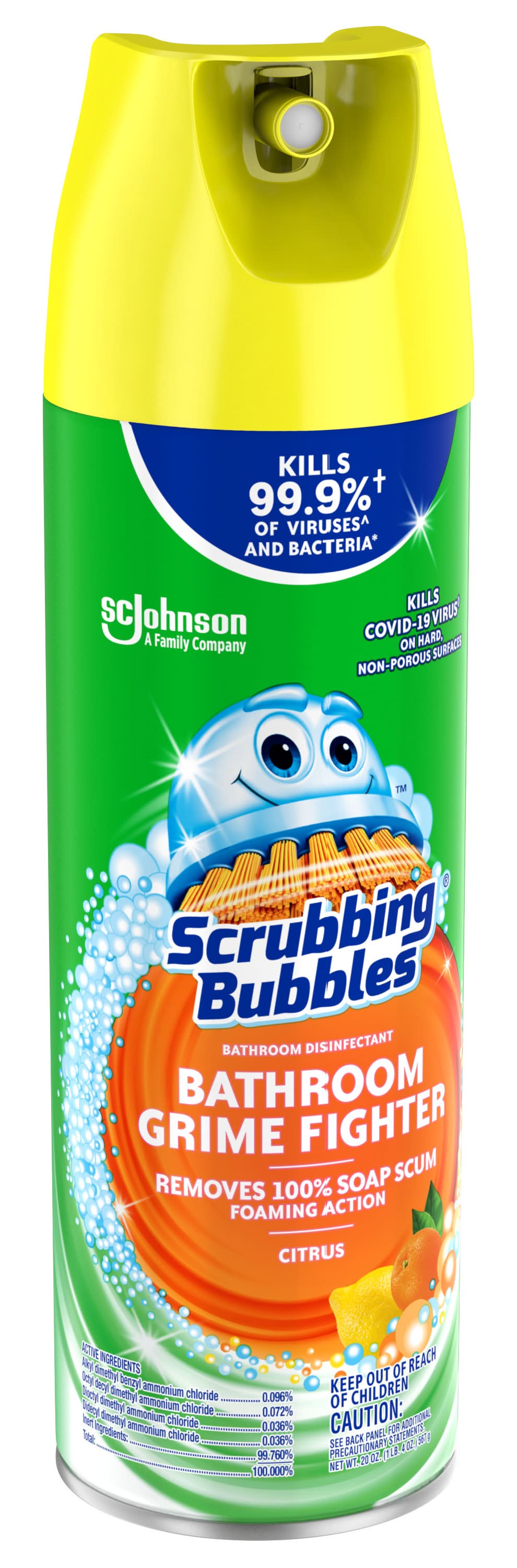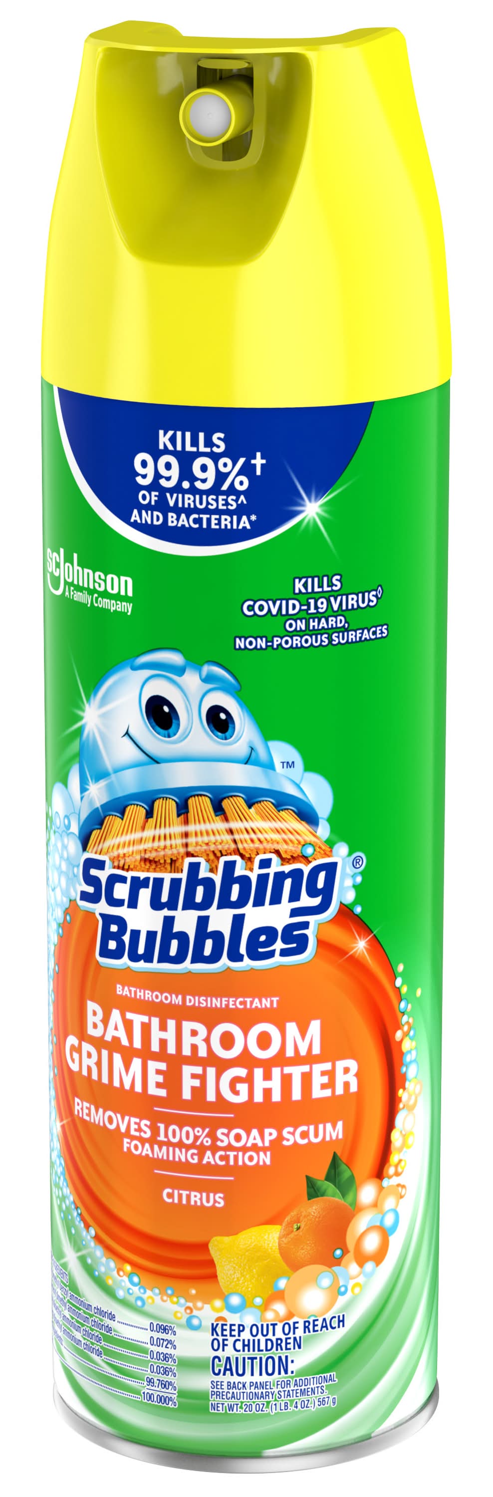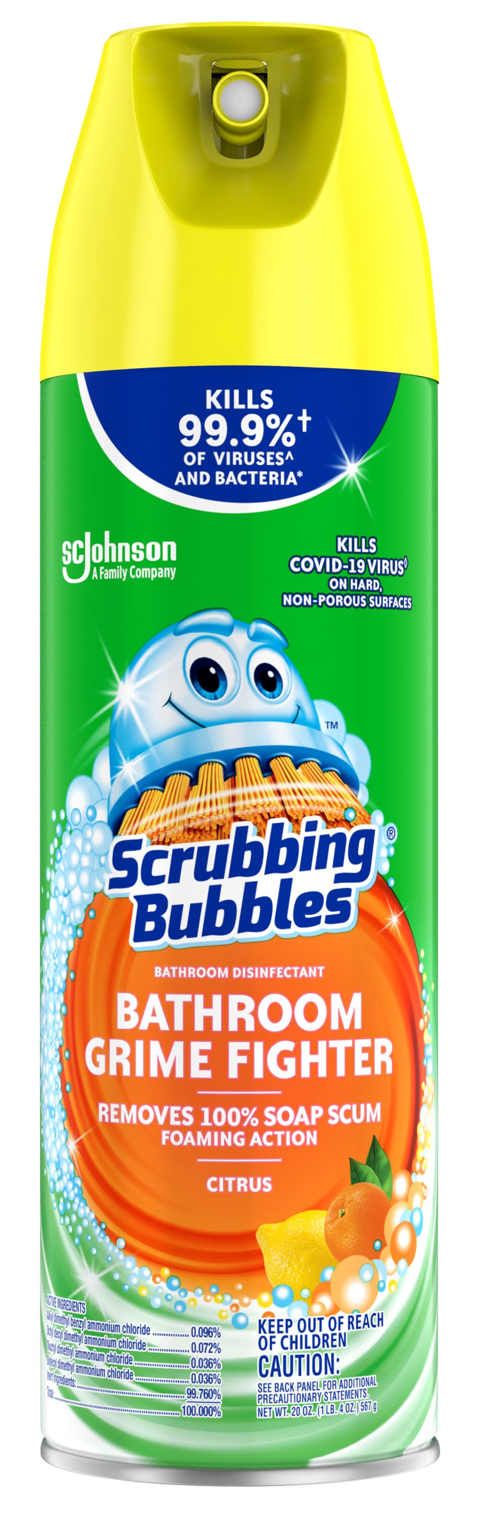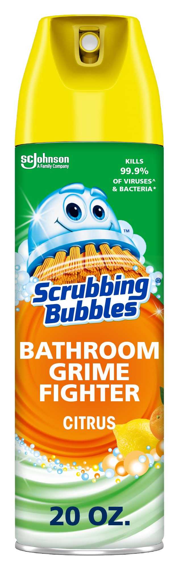 Scrubbing Bubbles Bathroom Grime Fighter Aerosol is a multisurface household disinfectant spray with a penetrating foam that takes on grime wherever it hides and kills 99.9% of viruses^ and bacteria*. With this all-purpose cleaner a clean bathroom is only a spray away. Bathroom Grime Fighter Aerosol is best for cleaning large bathroom spaces—like the bathtub or shower—and in hard-to-reach places like between tile and around fixtures. This 100% soap scum remover also delivers an amazing fragrance. Grime Fighter is an effective tile cleaner, sink cleaner, bathtub and shower cleaner, as well as an overall bathroom cleaner. This disinfectant cleaner is an easy way to get tough on bathroom surface messes. • Size: 20 OZ • S.c. Johnson & Son, Inc., Racine,WI,53403-2236,USA • Packaging: Reusable