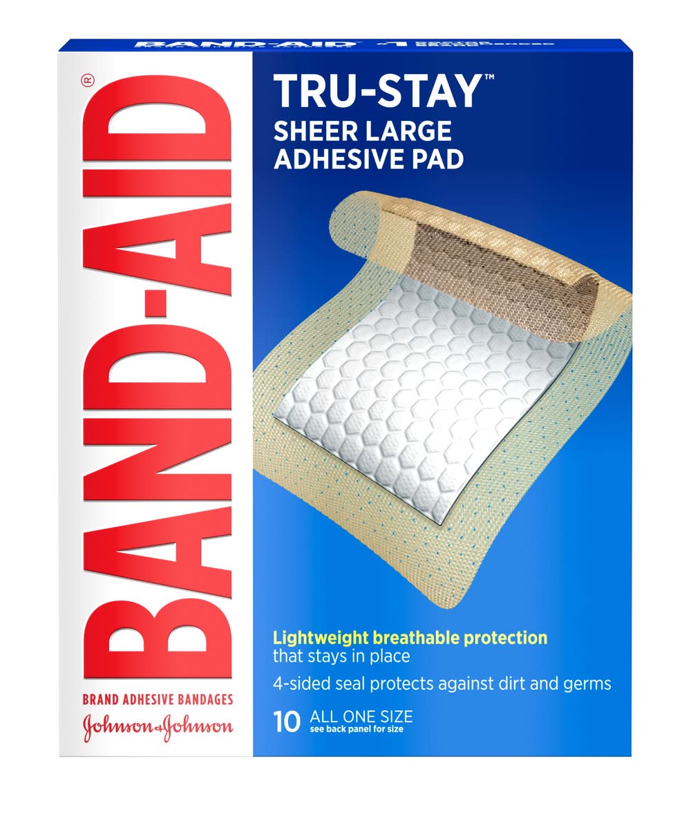 Band-Aid Tru-Stay Sheer Large Adhesive Pads provide lightweight breathable protection and are designed to stay in place. Each bandage features a four-sided seal to guard against dirt and germs, offering trusted protection for healing wounds. The tri-ply backing with a unique adhesive ensures the bandage remains secure, while the Quilt-Aid Comfort Pad cushions painful wounds during the healing process. These bandages are not made with natural rubber latex and are produced in Brazil. Suitable for covering wounds to help protect against infection, each pack contains 10 large adhesive pads measuring 2-7/8 inches by 4 inches. • Size: 10 CT • Johnson & Johnson Consumers Inc., Skillman, NJ, 08558 • Packaging: Reusable