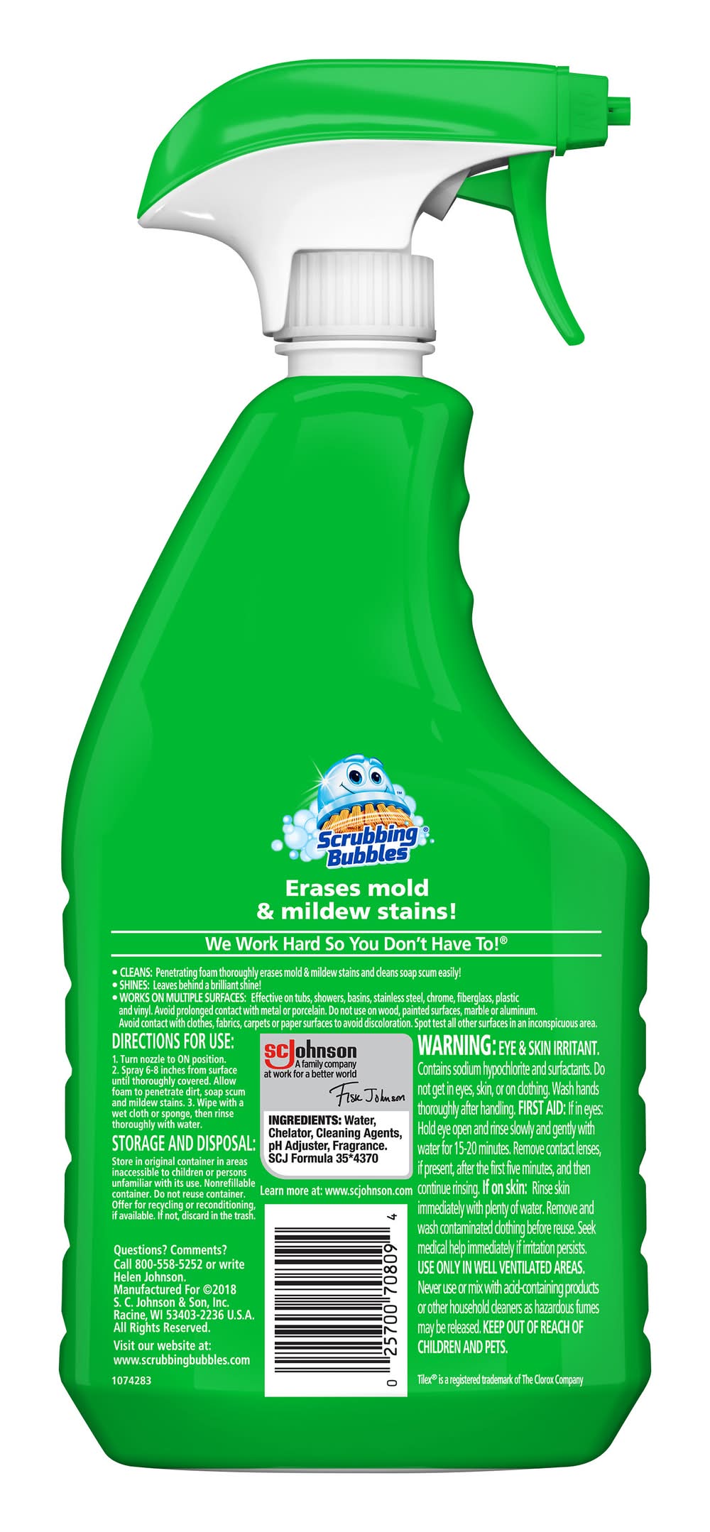 Clings 2.5x longer (Than Tilex Mold and mildew remover). SC Johnson. A family company. Erases mold & mildew stains. We work hard so you don't have to! Cleans: Penetrating foam thoroughly erases mold & mildew stains and cleans soap scum easily! Shines: Leaves behind a brilliant shine! Works on Multiple Surfaces: Effective on tubs, showers, basins, stainless steel, chrome, fiberglass, plastic and vinyl. Avoid prolonged contact with metal or porcelain. Do not use on wood, painted surfaces, marble or aluminum. Avoid contact with clothes, fabrics, carpets or paper surfaces to avoid discoloration. Spot test all other surfaces in an inconspicuous area. Fisk Johnson. Dye free formula. • Size: 32 OZ • S.c. Johnson & Son, Inc., Racine,WI,USA,53403-2236
