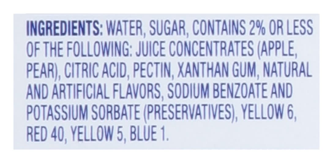 Ingredients: Water, Sugar, Contains 2% or Less of the Following: Juice Concentrates (Apple Pear), Citric Acid, Pectin, Xanthan Gum, Natural and Artificial Flavors, Sodium Benzoate and Potassium Sorbate (Preservatives), Yellow 6, Red 40, Yellow 5, Blue 1