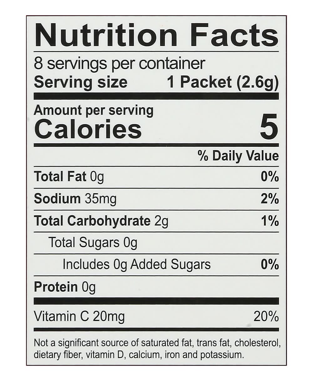 Ingredients: Citric Acid, Maltodextrin, Natural and Artificial Flavor, Aspartame (Phenylketonurics: Contains Phenylalanine), Salt, Contains Less than 2% of Acesulfame Potassium, Ascorbic Acid (Vitamin C), Blue 1, Red 40, Silicon Dioxide
