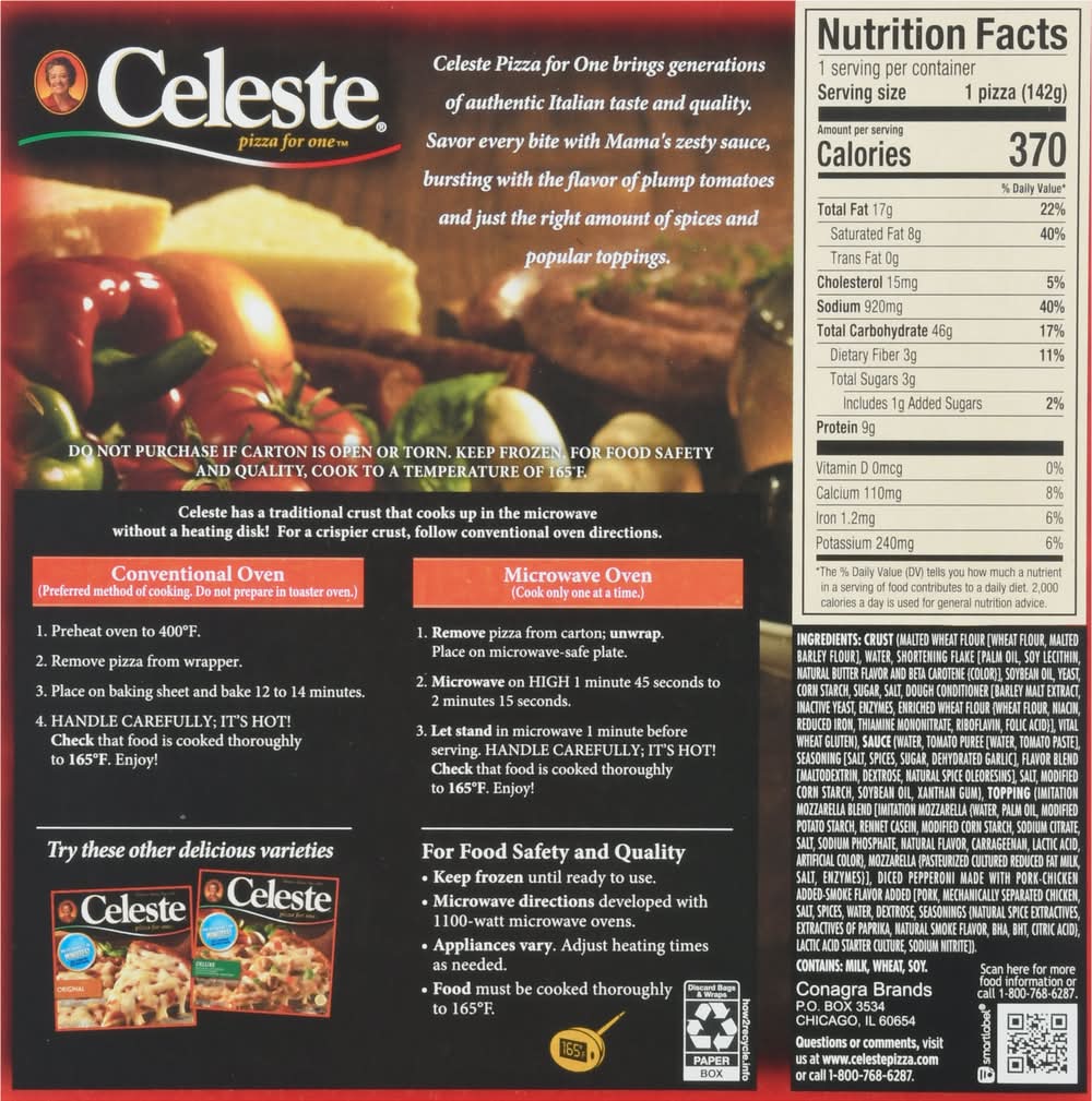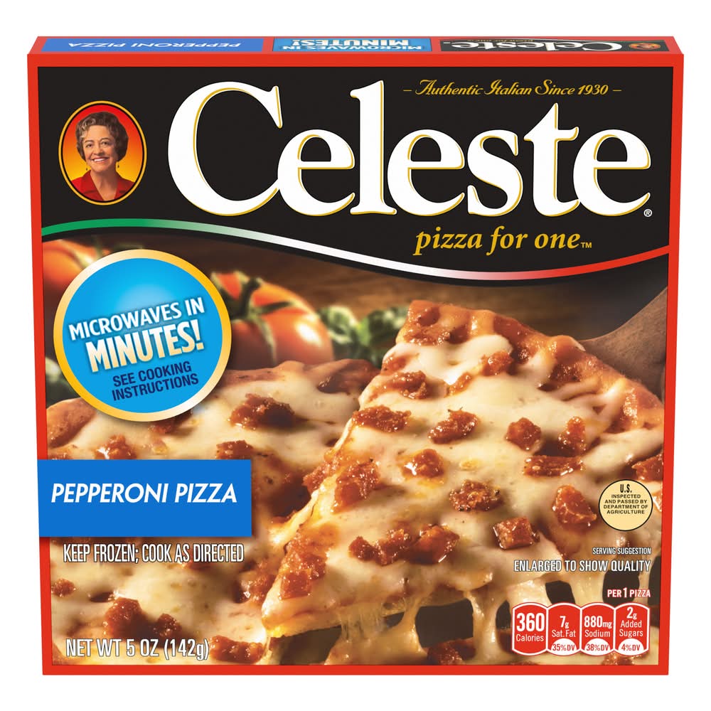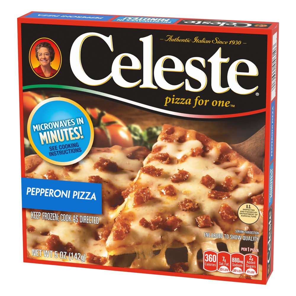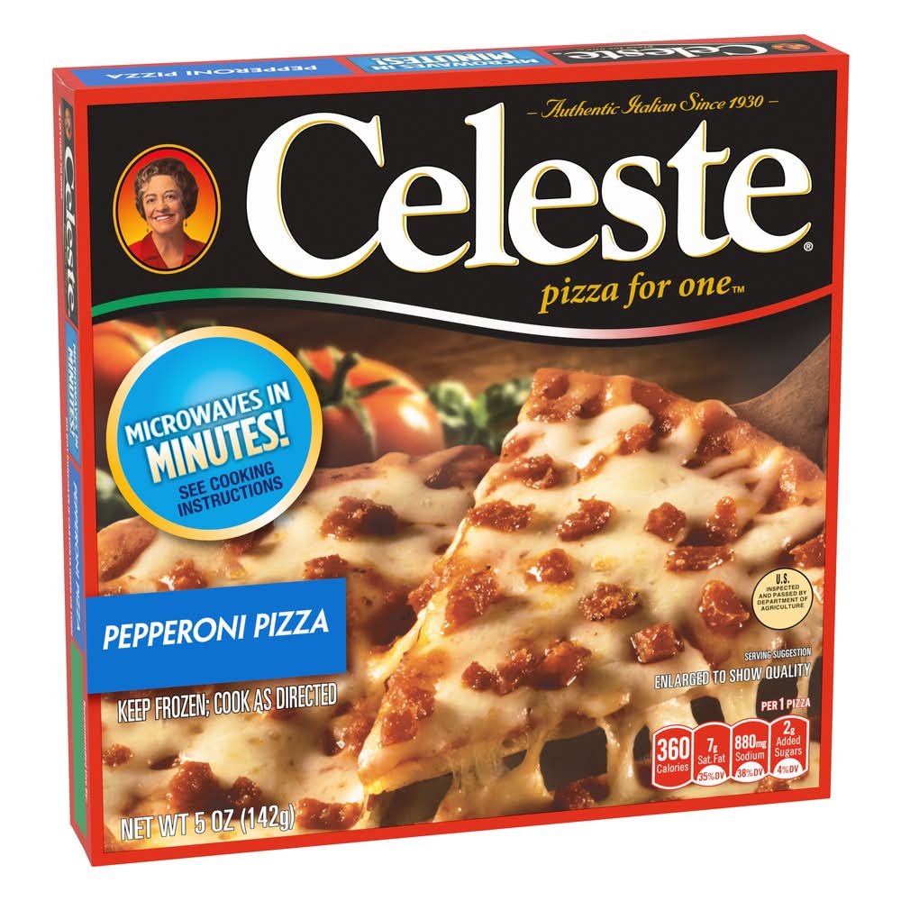 When you are craving delicious pepperoni pizza, try Celeste Pepperoni Pizza for One, Individual Microwavable Frozen Pizza. Tasty thin crust, topped with savory sauce, gooey cheese and yummy pepperoni for homemade-quality pizza the whole family will love. This microwave meal cooks in 2 minutes so it is perfect for a quick lunch, dinner or anytime meal. • Number of servings: 1 • Packaging: Reusable
