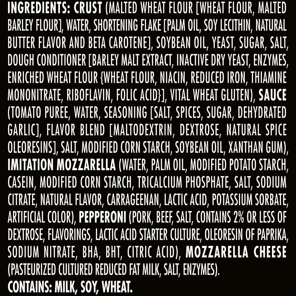 Ingredients: Crust Malted Wheat Flour [Wheat Flour, Malted Barley Flour], Water, Shortening Flake [Palm Oil, Soy Lecithin, Natural Butter Flavor and Beta Carotene {Color}], Soybean Oil, Yeast, Corn Starch, Sugar, Salt, Dough Conditioner [Barley Malt Extract. Inactive Yeast, Enzymes, Enriched Wheat Flour {Wheat Flour, Niacin, Reduced Iron, Thiamine Mononitrate, Riboflavin, Folic Acid}], Vital Wheat Gluten, Sauce Water, Tomato Puree [Water, Tomato Paste], Seasoning [Salt, Spices, Sugar, Dehydrated Garlic], Flavor Blend [Maltodextrin, Dextrose, Natural Spice Oleoresins], Salt, Modified Corn Starch, Soybean Oil, Xanthan Gum, Topping Imitation Mozzarella Blend [Imitation Mozzarella {Water, Palm Oil, Modified Potato Starch, Rennet Casein, Modified Corn Starch, Sodium Citrate, Salt, Sodium Phosphate, Natural Flavor, Carrageenan, Lactic Acid, Artificial Color}, Mozzarella Pasteurized Cultured Reduced Fat Milk, Salt, Enzymes}], Diced Pepperoni Made with Pork-Chicken Added-Smoke Flavor Added [Pork, Mechanically Separated Chicken, Salt, Spices, Water, Dextrose, Seasonings Natural Spice Extractives, Extractives of Paprika, Natural Smoke Flavor, BHA, BHT, Citric Acid}, Lactic Acid Starter Culture, Sodium Nitrite]. Contains: Milk, Wheat, Soybeans, Corn, Gluten, Barley