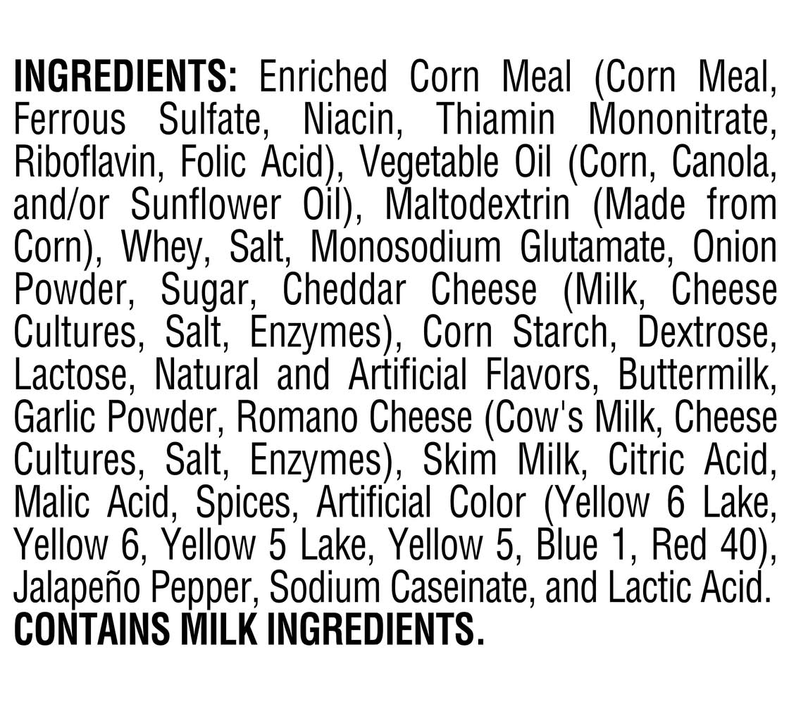 Ingredients: Enriched Corn Meal (Corn Meal, Ferrous Sulfate, Niacin, Thiamin Mononitrate, Riboflavin, Folic Acid), Vegetable Oil (Corn, Canola, And/Or Sunflower Oil), Maltodextrin (Made From Corn), Whey, Salt, Monosodium Glutamate, Onion Powder, Sugar, Cheddar Cheese (Milk, Cheese Cultures, Salt, Enzymes), Corn Starch, Dextrose, Lactose, Natural And Artificial Flavors, Buttermilk, Garlic Powder, Romano Cheese (Cow'S Milk, Cheese Cultures, Salt, Enzymes), Skim Milk, Citric Acid, Malic Acid, Spices, Artificial Color (Yellow 6 Lake, Yellow 6, Yellow 5 Lake, Yellow 5, Blue 1, Red 40), Jalapeño Pepper, Sodium Caseinate, And Lactic Acid. CONTAINS MILK INGREDIENTS. Contains: Contains Milk Ingredients.