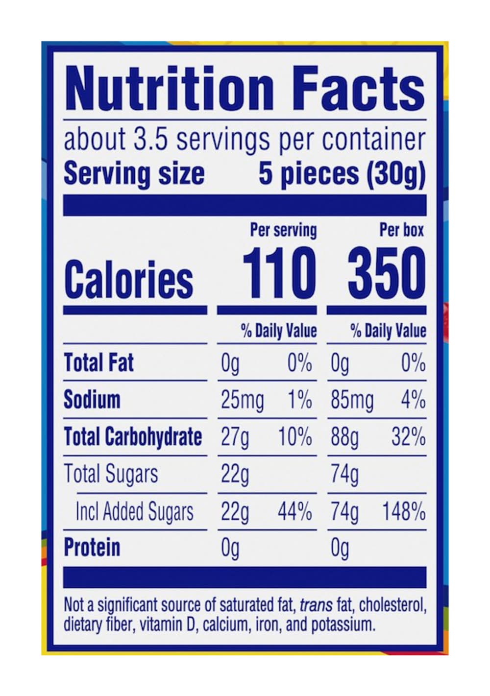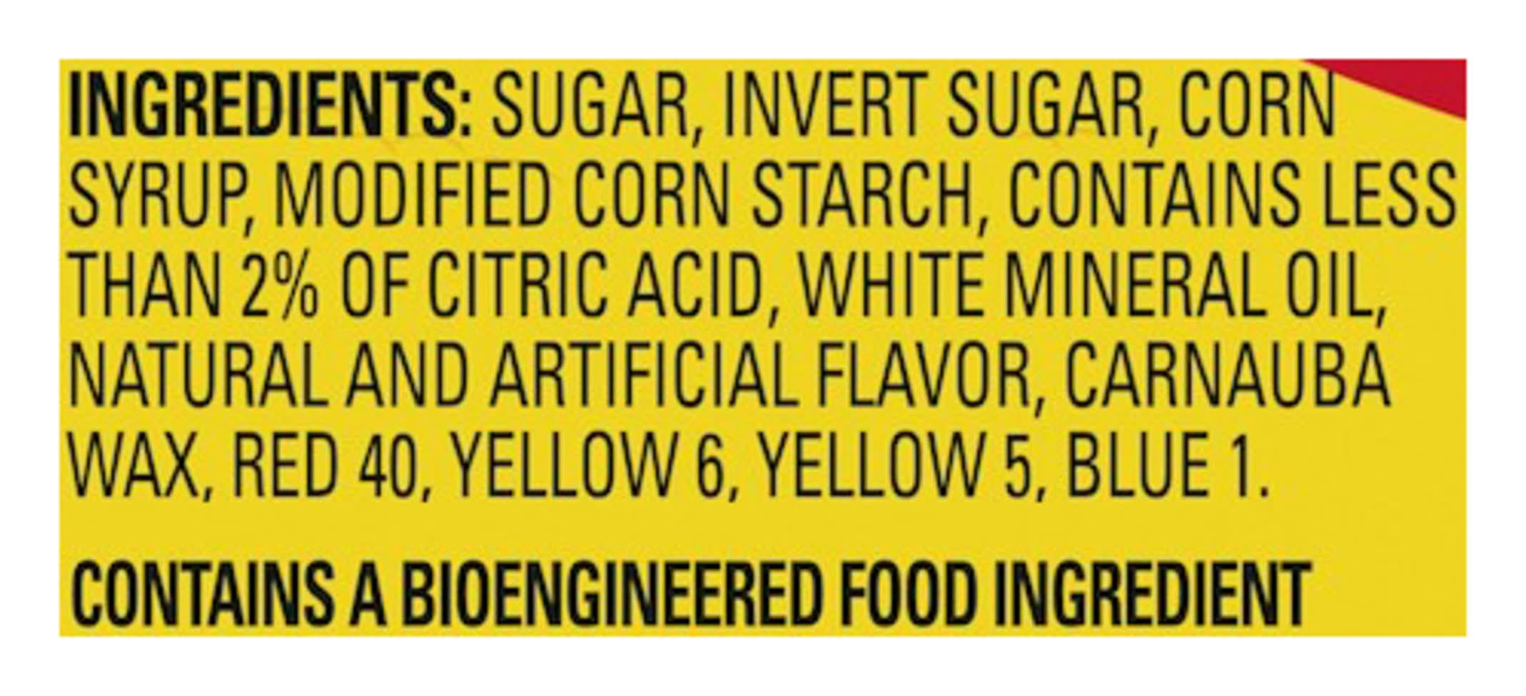 Ingredients: INGREDIENTS: SUGAR, INVERT SUGAR, CORN SYRUP, MODIFIED CORN STARCH, CONTAINS LESS THAN 2% OF CITRIC ACID, WHITE MINERAL OIL, NATURAL AND ARTIFICIAL FLAVOR, CARNAUBA WAX, RED 40, YELLOW 6, YELLOW 5, BLUE 1.
