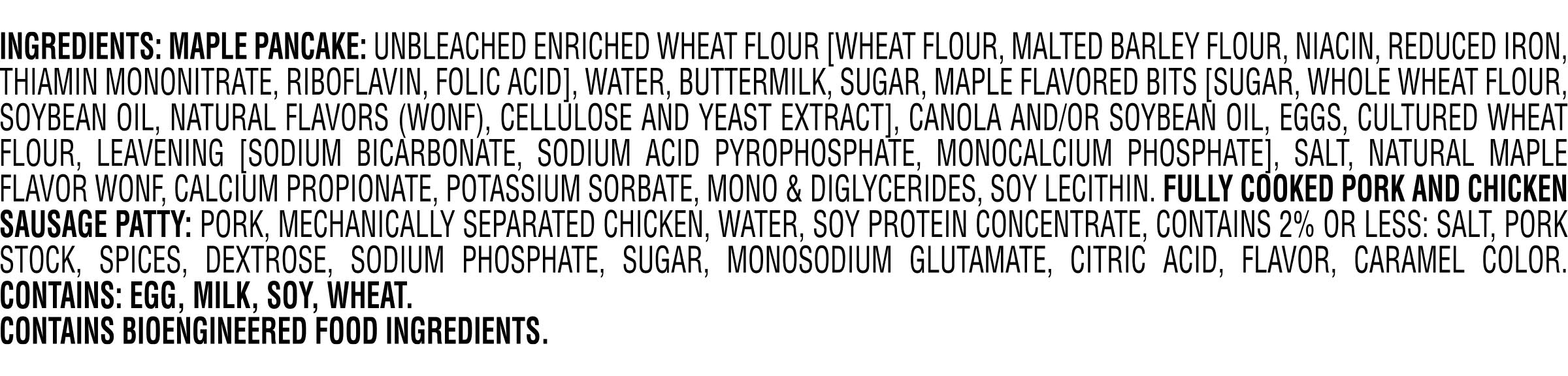 Ingredients: Maple Pancake: Unbleached Enriched Wheat Flour [Wheat Flour, Malted Barley Flour, Niacin, Reduced Iron, Thiamin Mononitrate, Riboflavin, Folic Acid], Water, Buttermilk, Sugar, Maple Flavored Bits [Sugar, Whole Wheat Flour, Soybean Oil, Natural Flavors (WONF), Cellulose And Yeast Extract], Canola And/Or Soybean Oil, Eggs, Cultured Wheat Flour, Leavening [Sodium Bicarbonate, Sodium Acid Pyrophosphate, Monocalcium Phosphate], Salt, Natural Maple Flavor WONF, Calcium Propionate, Potassium Sorbate, Mono and Diglycerides, Soy Lecithin. Fully Cooked Pork And Chicken Sausage Patty: Pork, Mechanically Separated Chicken, Water, Soy Protein Concentrate, Contains 2% Or Less: Salt, Pork Stock, Spices, Dextrose, Sodium Phosphate, Sugar, Monosodium Glutamate, Citric Acid, Flavor, Caramel Color. Contains: Eggs, Milk, Soy, Wheat
