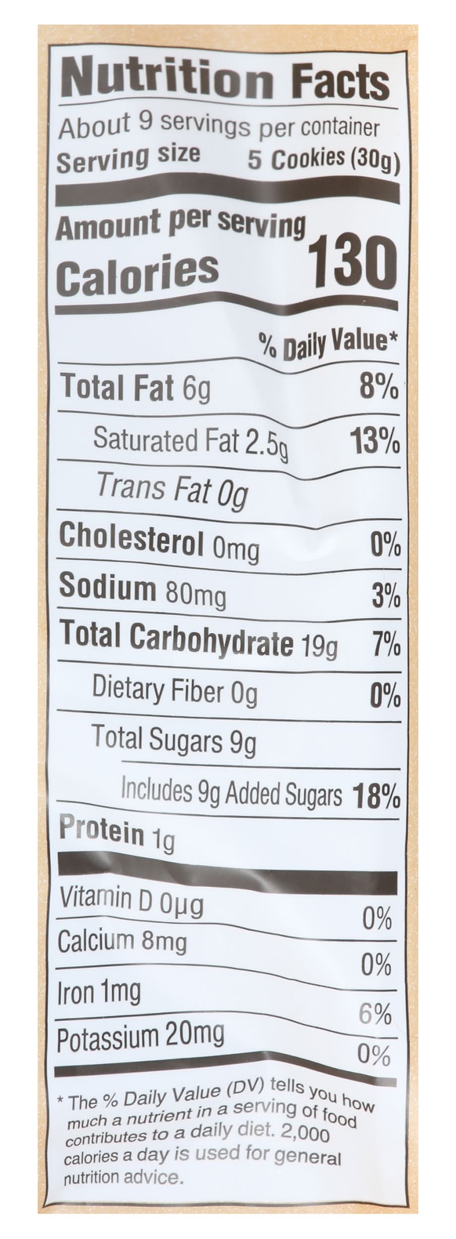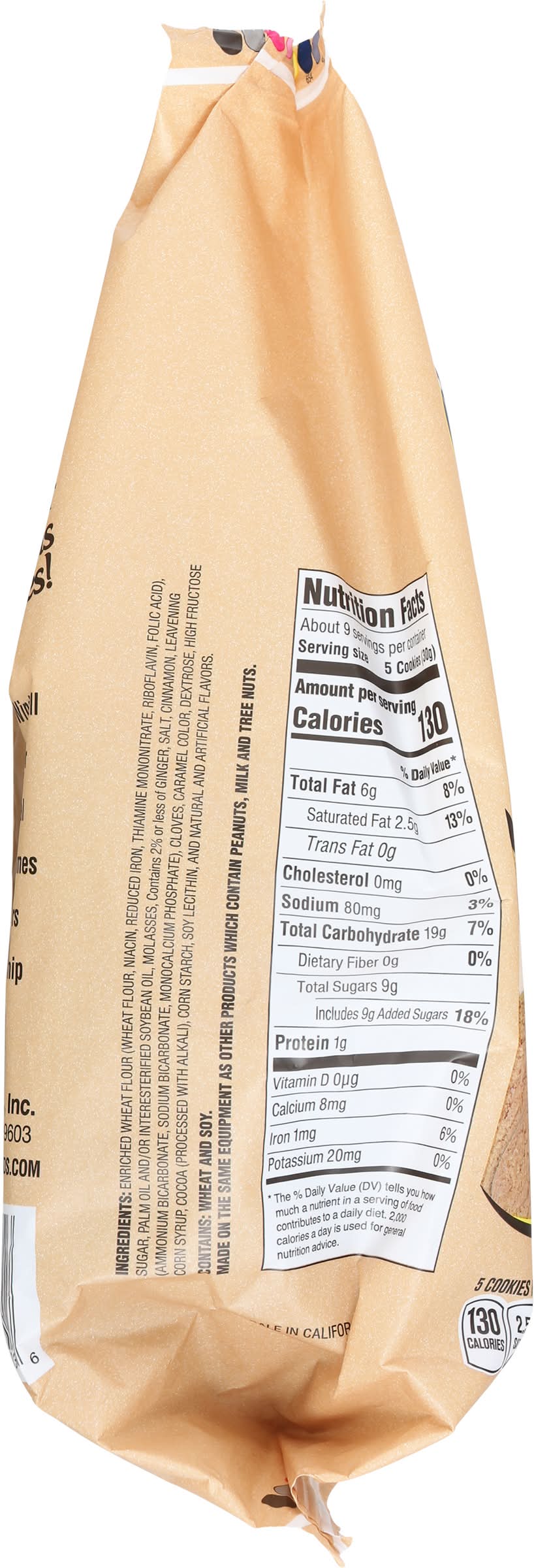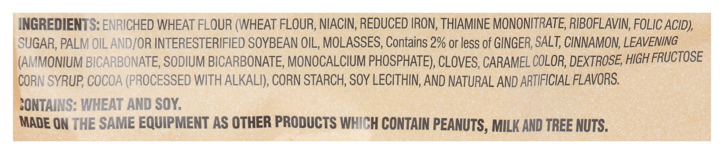 Ingredients: Enriched Wheat Flour (Wheat Flour, Niacin, Reduced Iron, Thiamine Mononitrate, Riboflavin, Folic Acid) Sugar, Palm Oil and/or Interesterified Soybean Oil, Molasses, Contains 2% or Less of Ginger, Salt, Cinnamon, Leavening (Ammonium Bicarbonate, Sodium Bicarbonate, Monocalcium Phosphate), Cloves, Caramel Color, Dextrose, High Fructose Corn Syrup, Cocoa (Processed with Alkali), Corn Starch, Soy Lecithin, and Natural and Artificial Flavors Contains: Wheat, Soybeans, Peanuts, Milk, Tree Nuts
