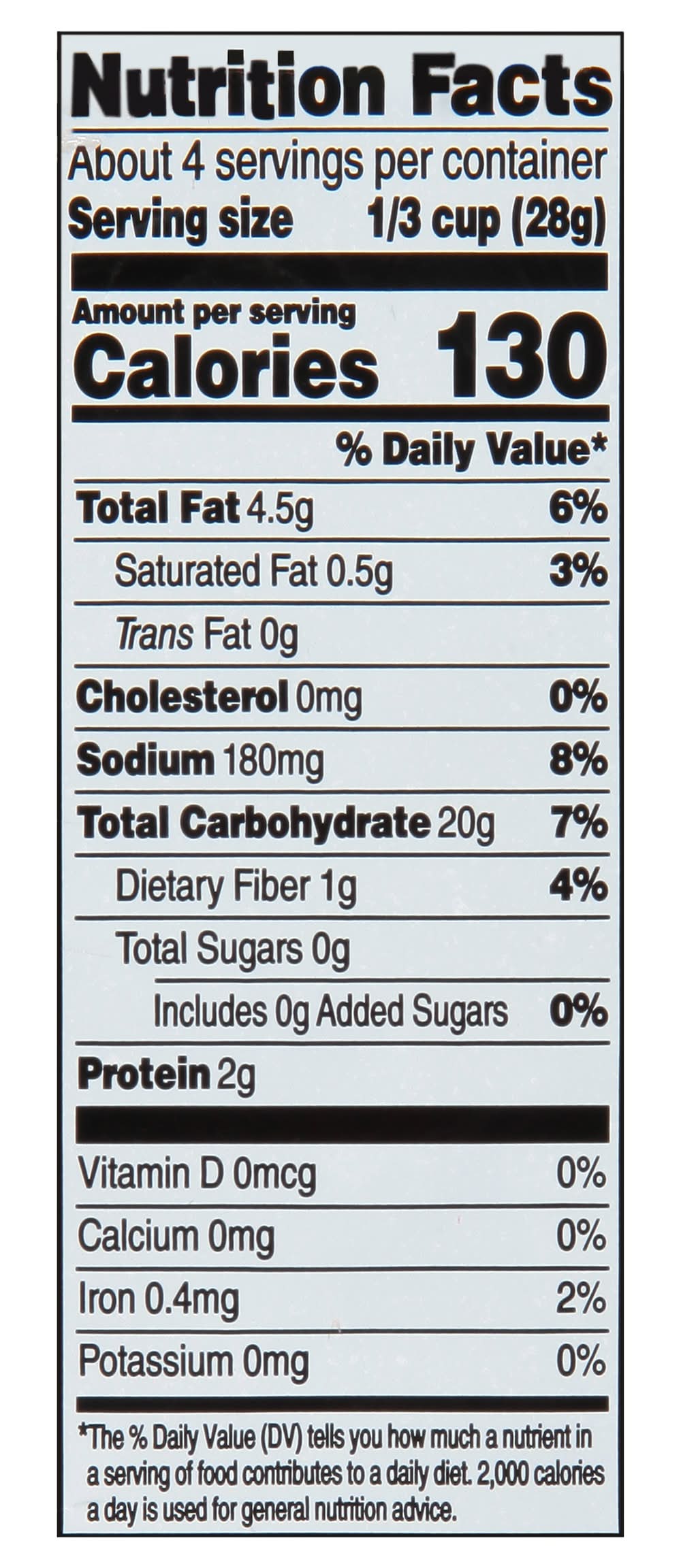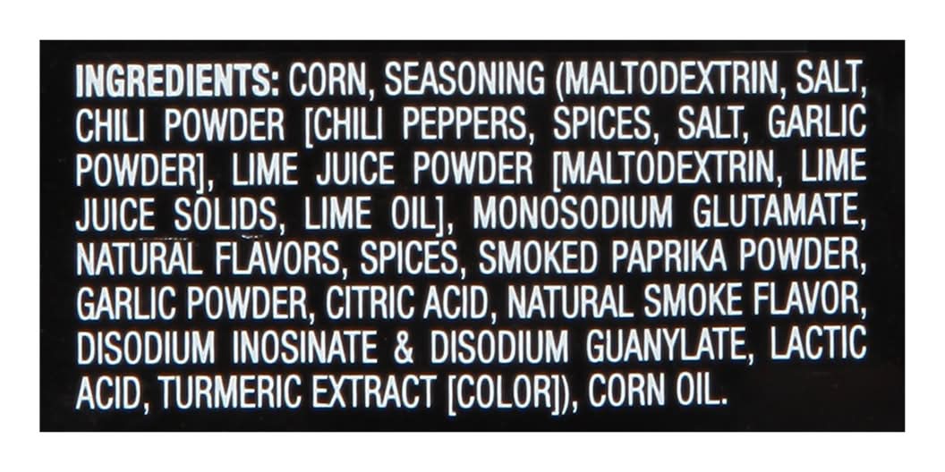 Ingredients: Corn, Seasoning (Maltodextrin, Salt, Chili Powder [Chili Peppers, Spices, Salt, Garlic Powder], Lime Juice Powder [Maltodextrin, Lime Juice Solids, Lime Oil], Monosodium Glutamate, Natural Flavors, Spices, Smoked Paprika Powder, Garlic Powder, Citric Acid, Natural Smoke Flavor, Disodium Inosinate & Disodium Guanylate, Lactic Acid, Turmeric Extract [Color]), Corn Oil Contains: Corn