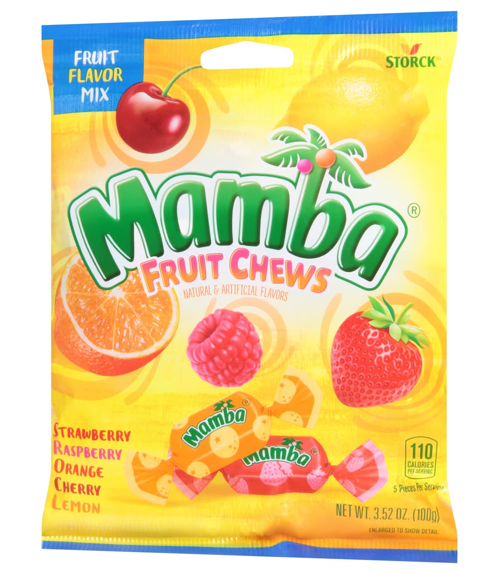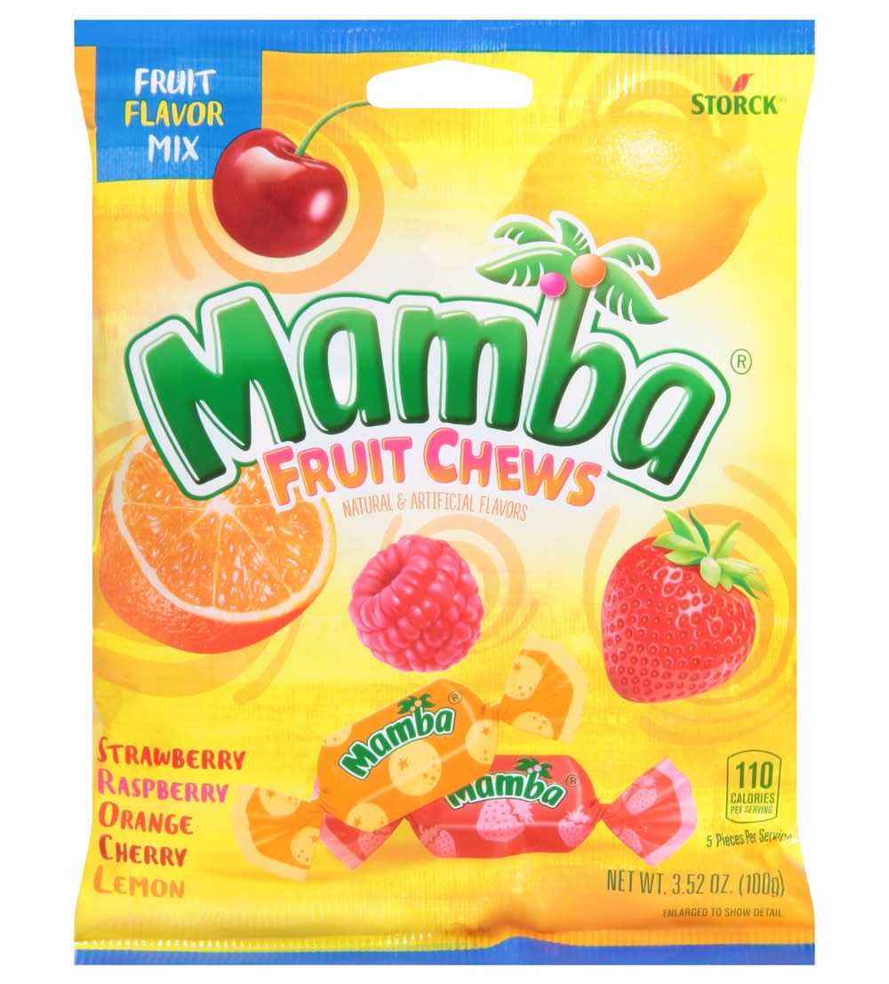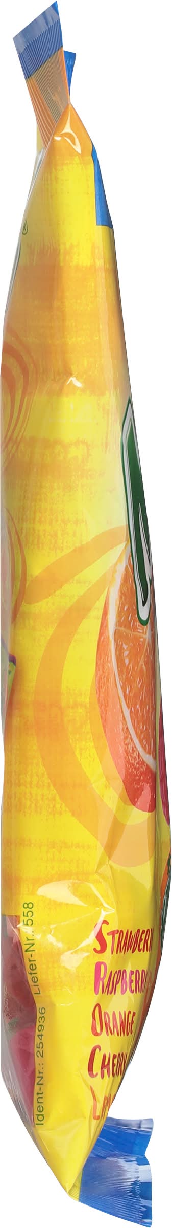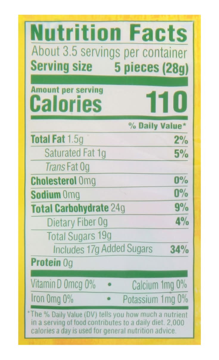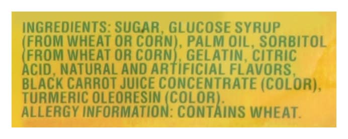 Ingredients: Sugar, Glucose Syrup (from Wheat or Corn), Palm Oil, Sorbitol (from Wheat or Corn), Gelatin, Citric Acid, Natural and Artificial Flavors, Black Carrot Juice Concentrate (Color), Turmeric Oleoresin (Color) Contains: Wheat, Corn