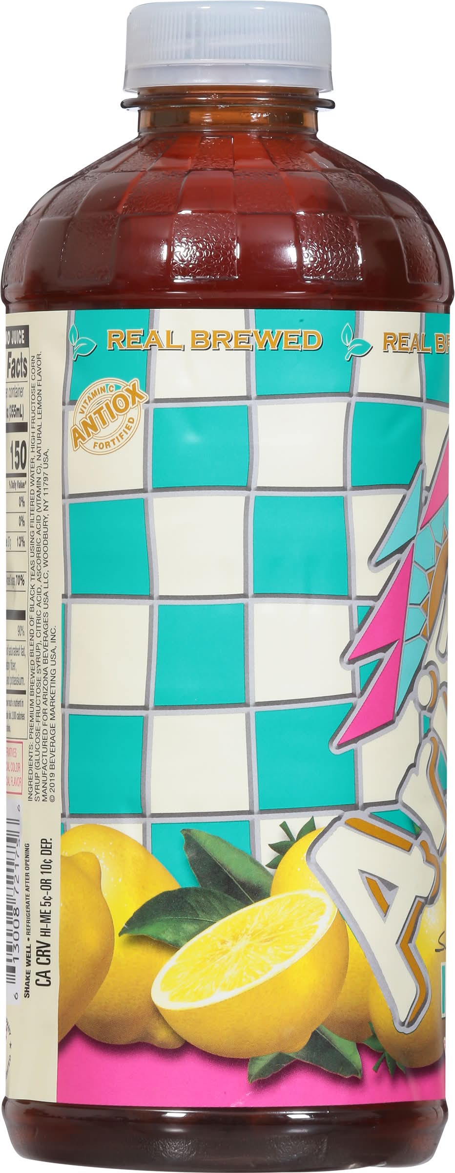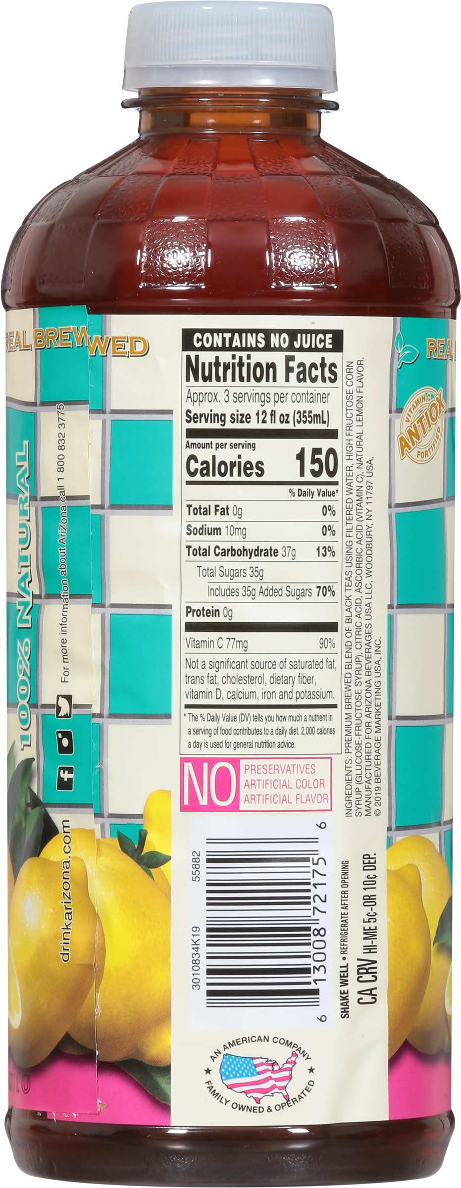 All the health benefits of tea... with a little twist on flavor! AriZona offers up delicious tea with just the right amount of sweetness and natural lemon flavor. Large 34-oz. bottles are great for parties, day care centers, camps, care facilities, homes, and more.PROP 65 BPA Many cans containing foods and beverages sold here have epoxy linings used to avoid microbial contamination and to extend shelf life. Lids on jars and caps on bottles may also have epoxy linings. Some of these linings can leach small amounts of bisphenol A (BPA) into the food or beverage. BPA is a chemical known to the State of California to cause harm to the female reproductive system. For more information go to: www.P65Warnings.ca.gov/BPA • Flavor: Lemon • Arizona Beverages USA LLC, Woodbury,NY,11797 • Packaging: Reusable