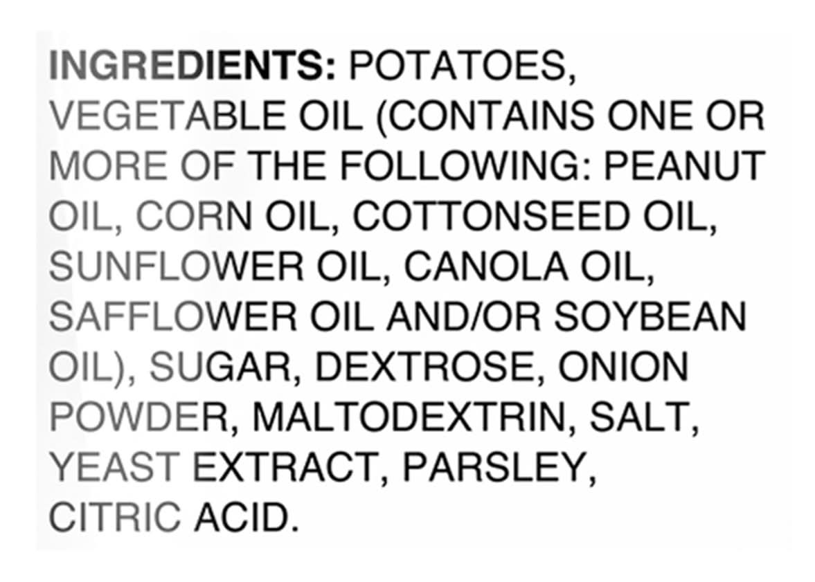 Ingredients: Potatoes, Vegetable Oil (Contains One or More of the Following: Peanut Oil, Corn Oil, Cottonseed Oil, Sunflower Oil, Canola Oil, Safflower Oil and/or Soybean Oil), Sugar, Dextrose, Onion Powder, Maltodextrin, Salt, Yeast Extract, Parsley, Citric Acid Contains: Peanuts, Soybeans