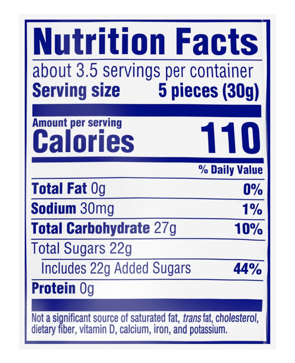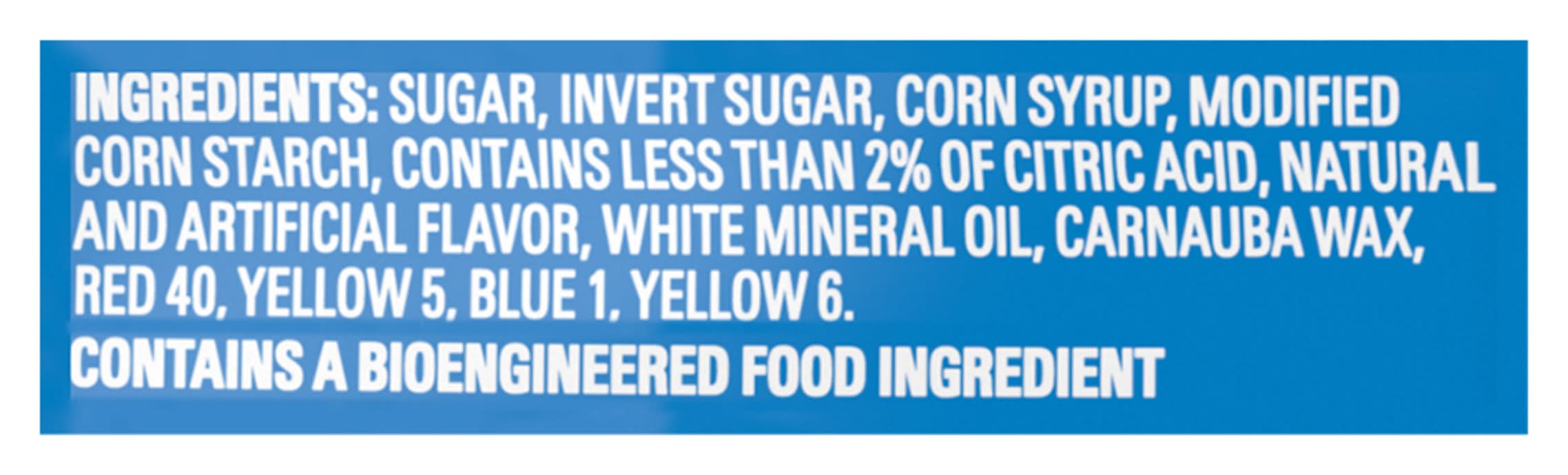 Ingredients: INGREDIENTS: SUGAR, INVERT SUGAR, CORN SYRUP, MODIFIED CORN STARCH, CONTAINS LESS THAN 2% OF CITRIC ACID, NATURAL AND ARTIFICIAL FLAVOR, WHITE MINERAL OIL, CARNAUBA WAX, RED 40, YELLOW 5, BLUE 1, YELLOW 6. Contains: Corn