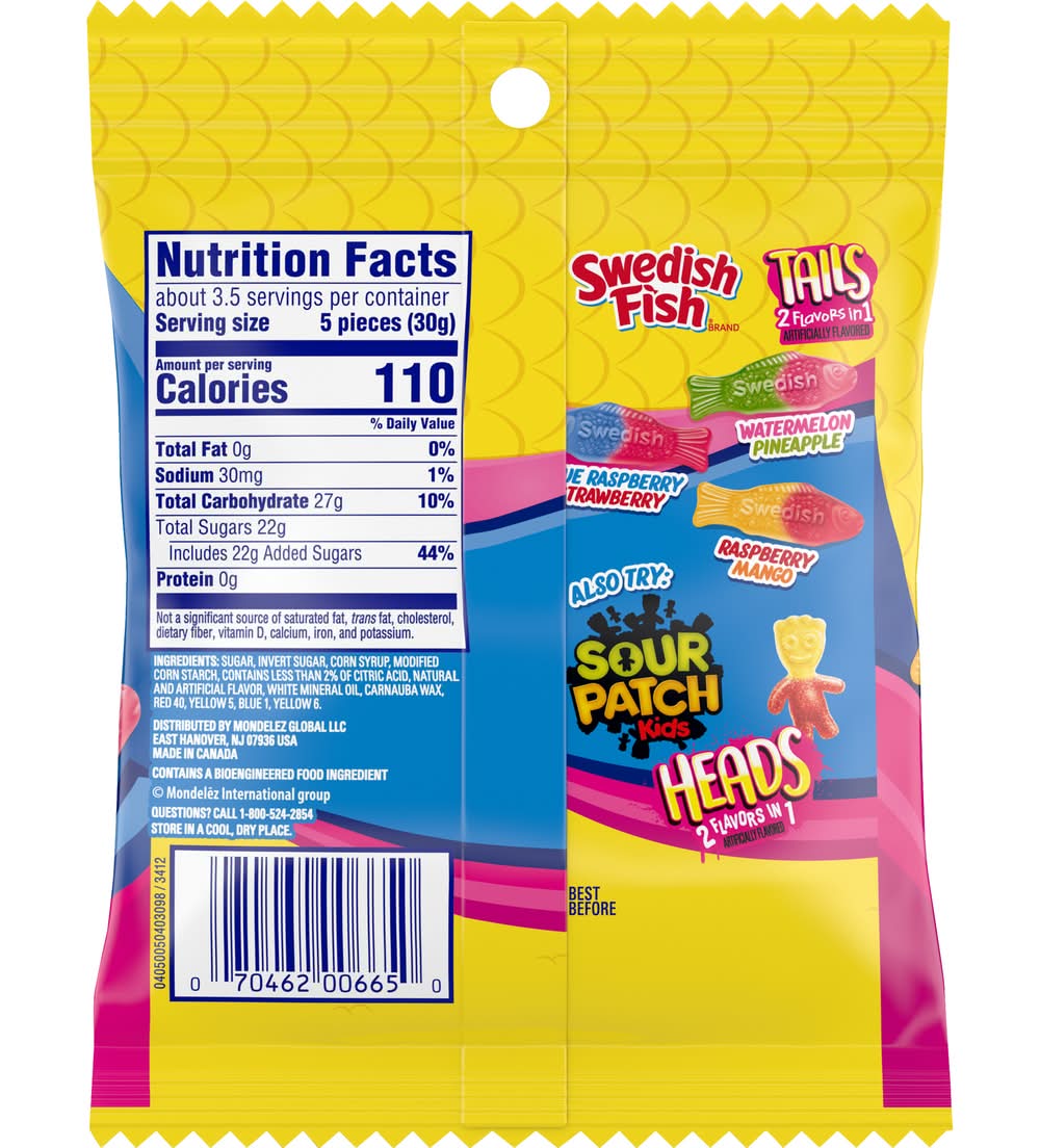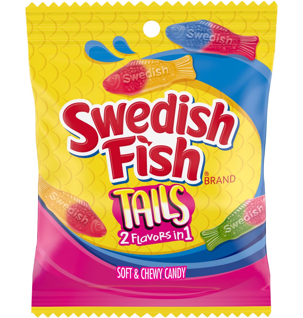 SWEDISH FISH Tails 2 Flavors in 1 Soft & Chewy Candy doubles up on the deliciousness with two flavors in each sweet candy piece. With three different flavor combinations, including blue raspberry strawberry, watermelon pineapple and raspberry mango, your taste buds will be swimming with flavor in every bite. The classic fish shape in bright colors adds a bit of excitement to your candy experience, no matter what the occasion. A fat free food, this fruit flavored candy adds a bit of excitement to your candy experience, no matter what the occasion. Keep SWEDISH FISH gummy snacks on-hand for quick snacks or as party favors for holidays or birthdays. This soft candy also makes a tasty movie theater candy to snack on during your favorite flick. Each package of bagged candy is the perfect size for storing in your purse, backpack or lunchbox for grab-and-go chewy snacks. Flavor: Blue raspberry strawberry- watermelon pineapple-raspberry mango