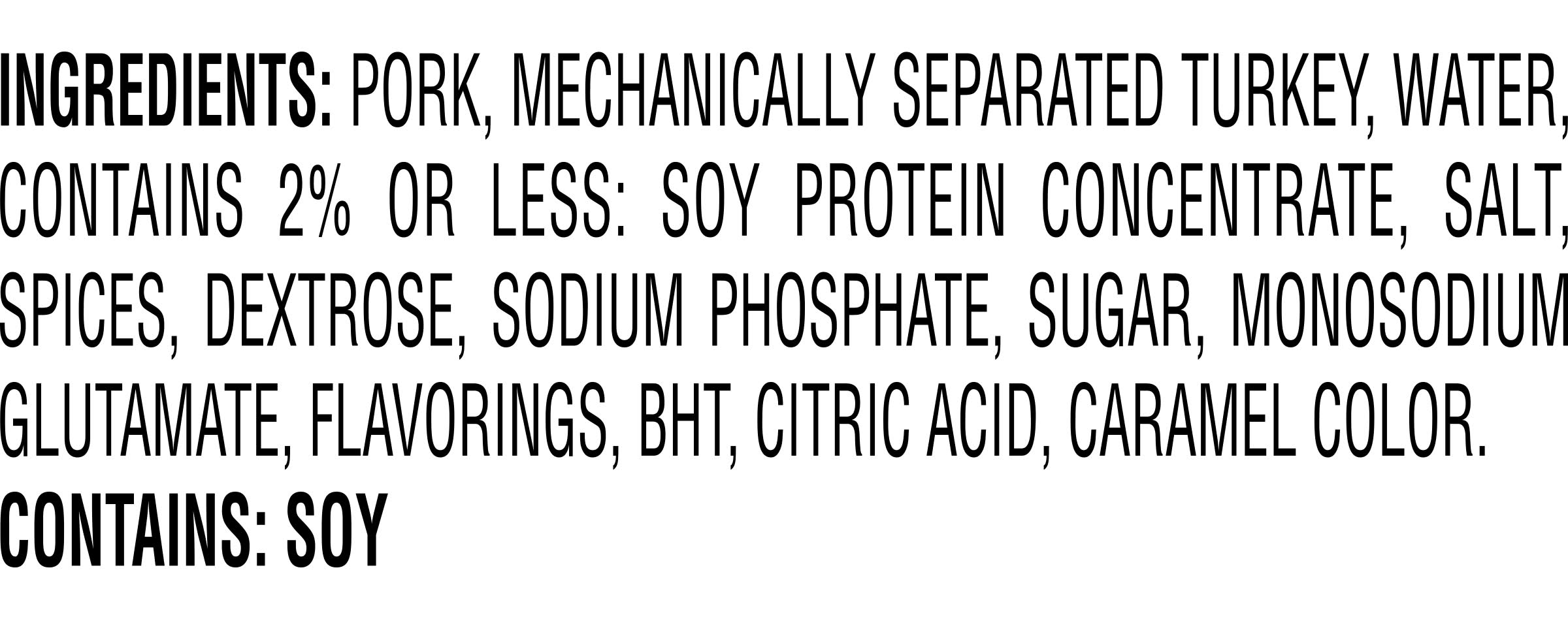 Ingredients: Pork, mechanically separated turkey, water, contains 2% or less: soy protein concentrate, salt, spices, dextrose, sodium phosphate, sugar, monosodium glutamate, flavorings, BHT, citric acid, caramel color. Contains: Soy Additives: Contains sodium phosphates, dextrose, sugar, and monosodium glutamate.