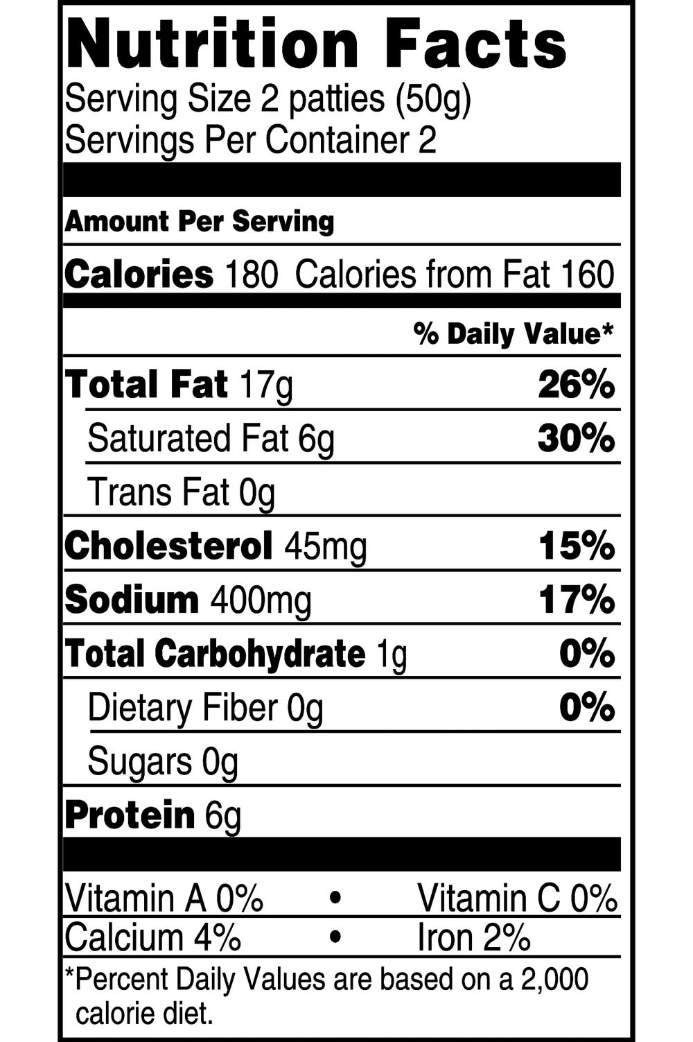 Directions for use: Directions: Microwave Heating Instructions: Instructions were developed using an 1100-watt microwave oven. Ovens vary; heat times may need to be adjusted. Microwave instructions (one serving): 1. Remove 2 patties from package. 2. Place on Microwave-safe plate and cover with a paper towel. 3. Microwave on high. If frozen: 60-65 seconds or until hot. If refrigerate: 50-55 seconds or until hot. Always follow heating instructions. Keep frozen. Peel. Storage recommendation: Keep frozen. Store in a freezer at 0°F or below.