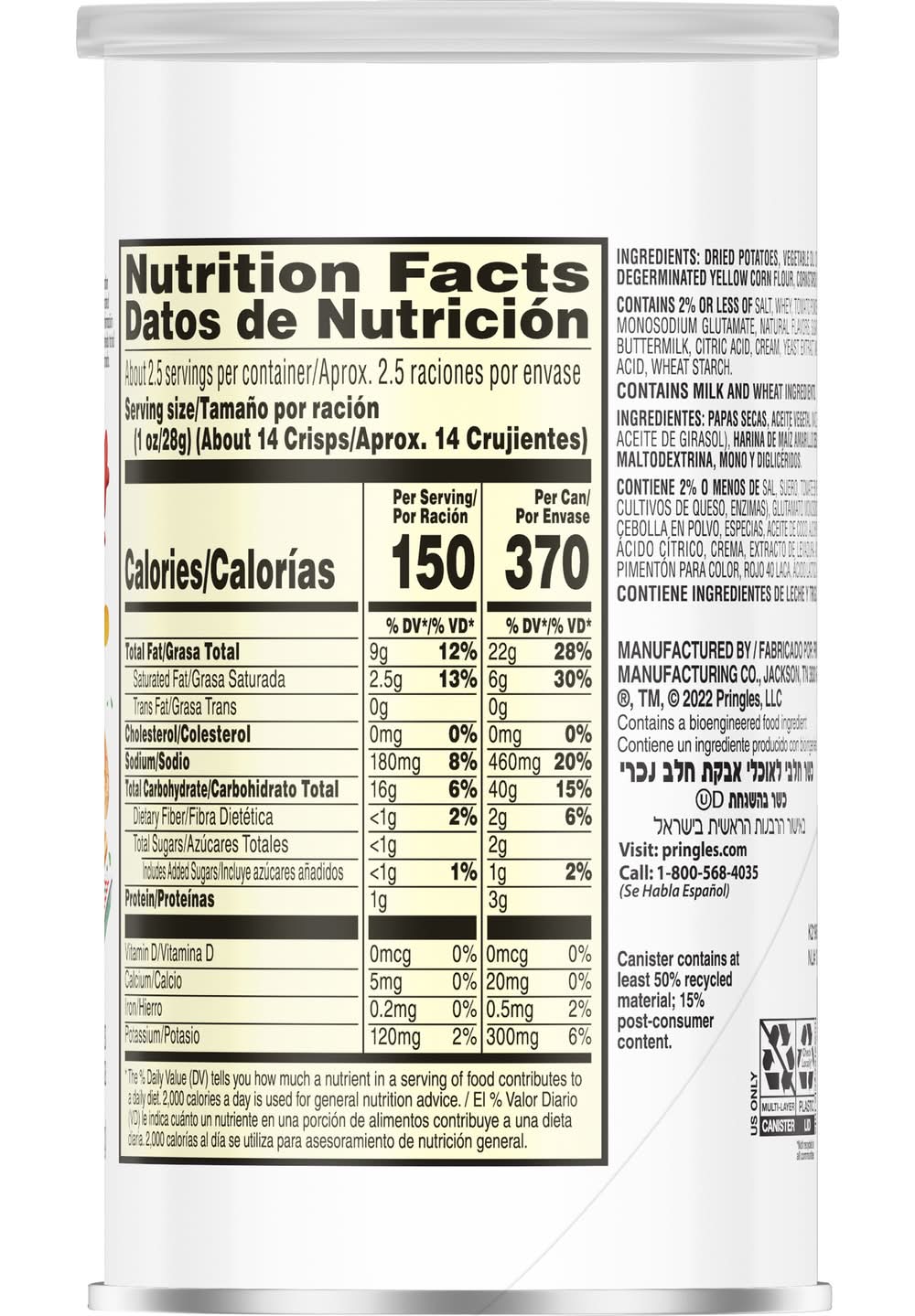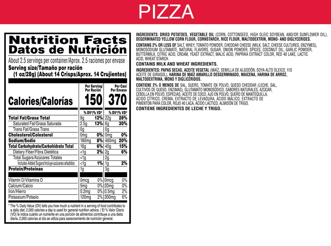 Ingredients: Dried Potatoes, Vegetable Oil (Corn Cottonseed High Oleic Soybean and/or Sunflower Oil), Degerminated Yellow Corn Flour, Cornstarch, Rice Flour, Maltodextrin, Mono- and Diglycerides, Contains 2% or Less of Salt, Whey, Tomato Powder, Cheddar Cheese (Milk Salt Cheese Cultures Enzymes), Monosodium Glutamate, Natural Flavors, Sugar, Onion Powder, Spices, Coconut Oil, Garlic Powder, Buttermilk, Citric Acid, Cream, Yeast Extract, Malic Acid, Paprika Extract Color, Red 40 Lake, Lactic Acid, Wheat Starch Contains: Milk, Tree Nuts, Soybeans