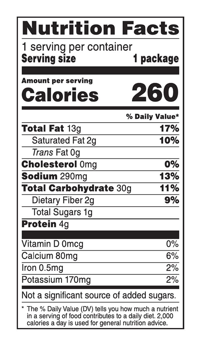 260 calories per pkg. See nutrition information for total fat content. Great with meals. Guaranteed fresh until printed date or this snack is on us. Flavor: Nacho cheese