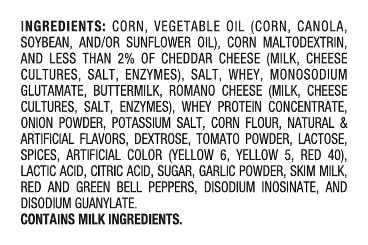 Ingredients: Corn, Vegetable Oil (Corn, Canola, Soybean, and/or Sunflower Oil), Corn Maltodextrin, and Less than 2% of Cheddar Cheese (Milk, Cheese Cultures, Salt, Enzymes), Salt, Whey, Monosodium Glutamate, Buttermilk, Romano Cheese (Milk, Cheese Cultures, Salt, Enzymes), Whey Protein Concentrate, Onion Powder, Potassium Salt, Corn Flour, Natural & Artificial Flavors, Dextrose, Tomato Powder, Lactose, Spices, Artificial Color (Yellow 6, Yellow 5, Red 40), Lactic Acid, Citric Acid, Sugar, Garlic Powder, Skim Milk, Red and Green Bell Peppers, Disodium Inosinate, and Disodium Guanylate Contains: Milk, Corn, Lactose, Soybeans