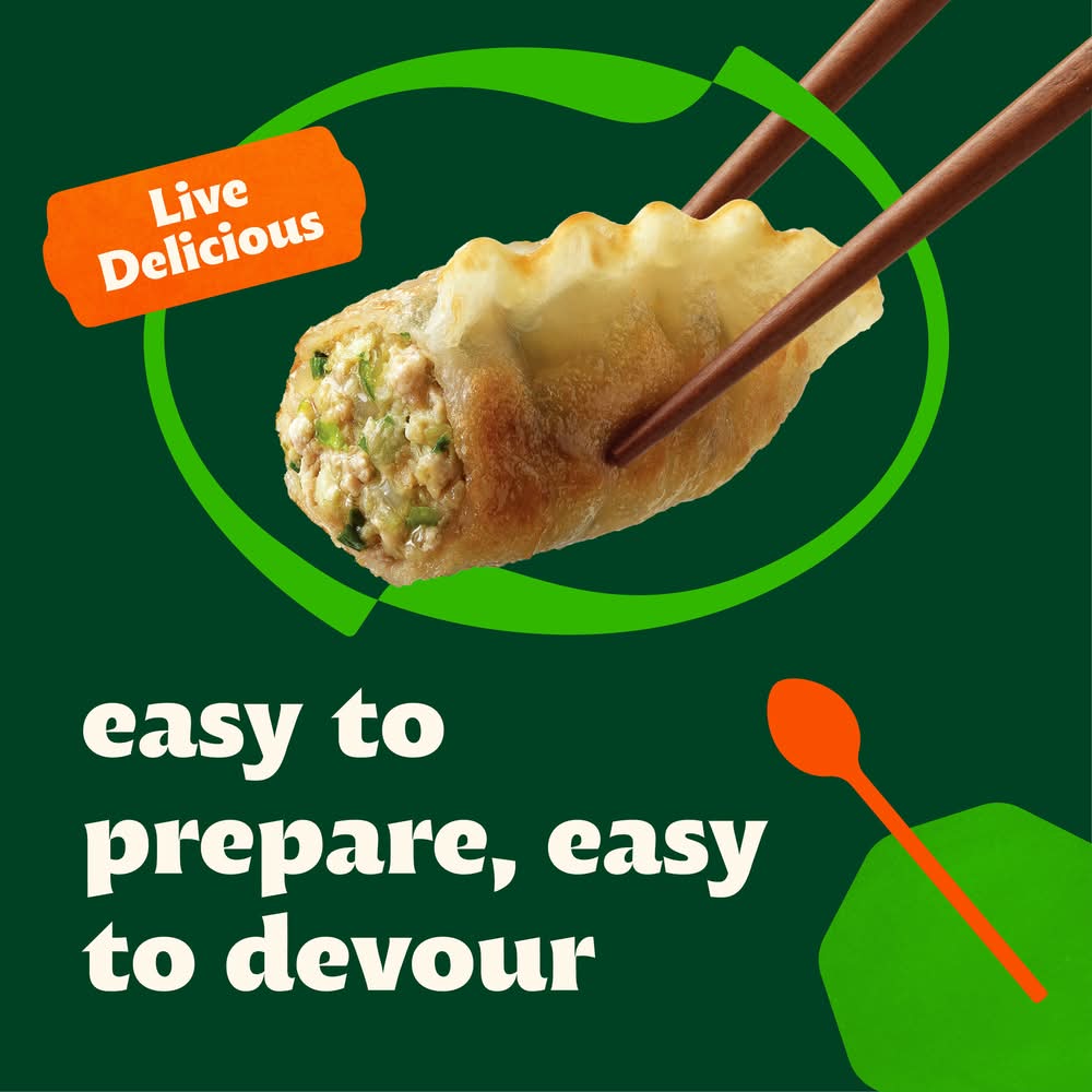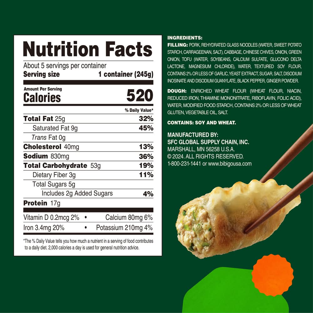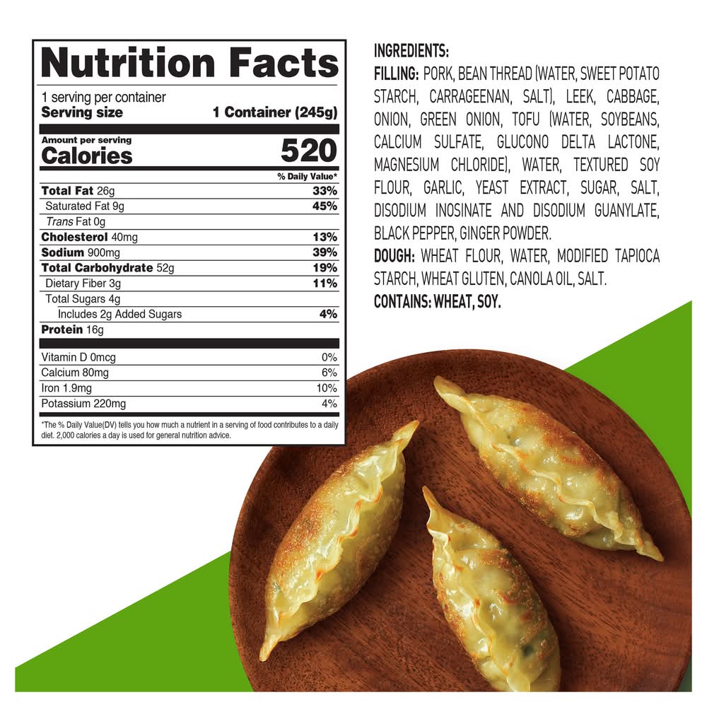 Ingredients: INGREDIENTS: FILLING: PORK, REHYDRATED GLASS NOODLES (WATER, SWEET POTATO STARCH, CARRAGEENAN, SALT), CABBAGE, CHINESE CHIVES, ONION, GREEN ONION, TOFU (WATER, SOYBEANS, CALCIUM SULFATE, GLUCONO DELTA LACTONE, MAGNESIUM CHLORIDE), WATER, TEXTURED SOY FLOUR, CONTAINS 2% OR LESS OF GARLIC, YEAST EXTRACT, SUGAR, SALT, DISODIUM INOSINATE AND DISODIUM GUANYLATE, BLACK PEPPER, GINGER POWDER. DOUGH: ENRICHED WHEAT FLOUR (WHEAT FLOUR, NIACIN, REDUCED IRON, THIAMINE MONONITRATE, RIBOFLAVIN, FOLIC ACID), WATER, MODIFIED FOOD STARCH, CONTAINS 2% OR LESS OF WHEAT GLUTEN, VEGETABLE OIL, SALT. Contains: Wheat, Soy