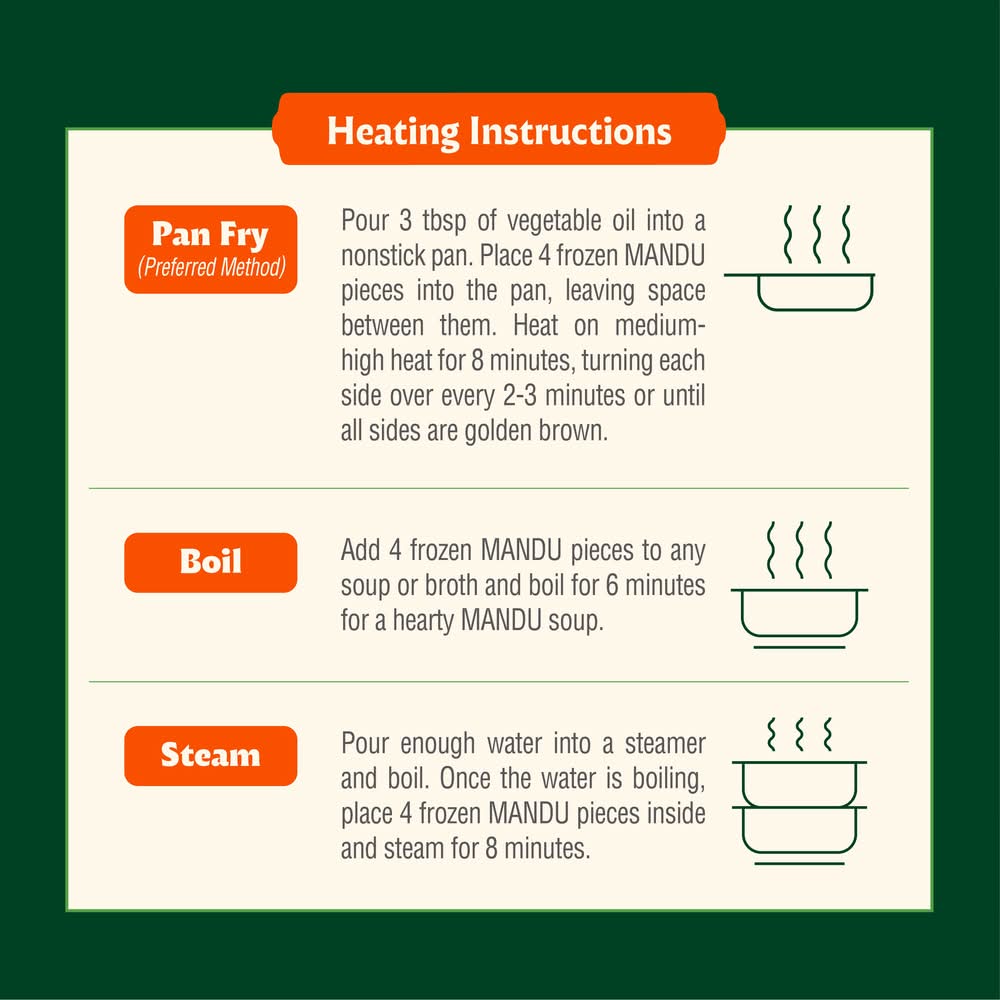 Directions for use: Directions: Heating Instructions: Pan Fry: Pour 3 tbsp of vegetable oil into a nonstick pan. Place 4 frozen Mandu pieces into the pan, leaving space between them. Heat on medium-high heat for 8 minutes, turning each side over every 2-3 minutes or until all sides are golden brown Boil: Add 4 frozen Mandu pieces to any soup or broth and boil for 6 minutes for a hearty Mandu soup. Steam: Pour enough water into a steamer and boil. Once the water is boiling, place 4 frozen Mandu pieces inside and steam for 8 minutes. Keep frozen. Storage recommendation: Keep frozen.