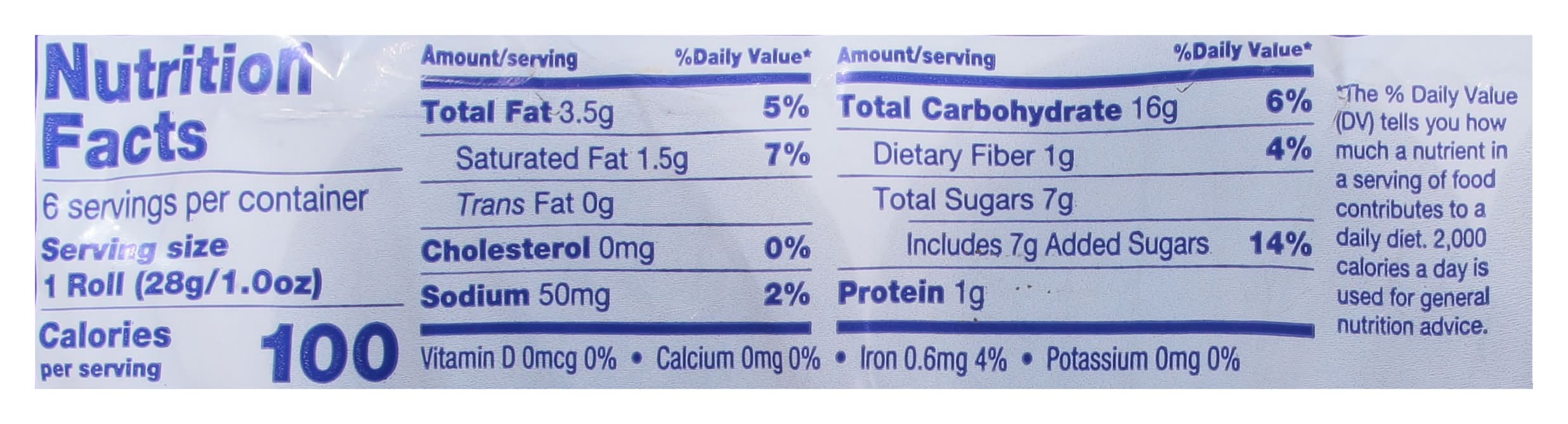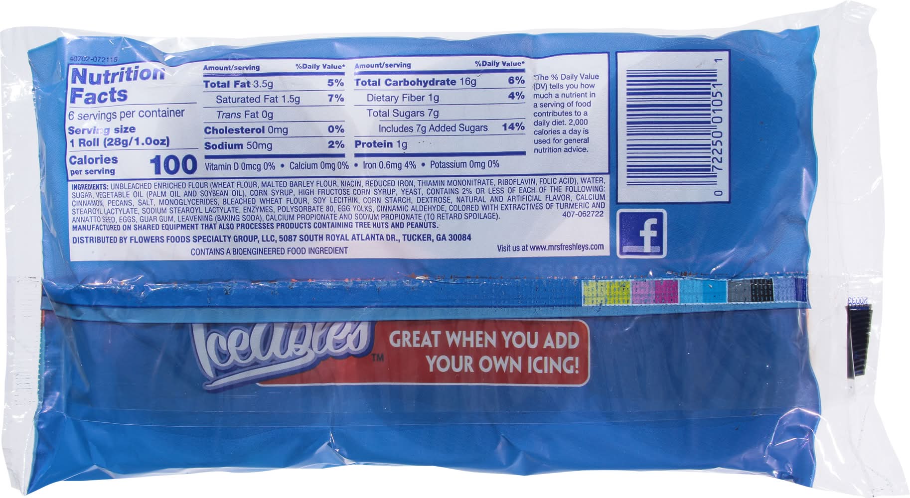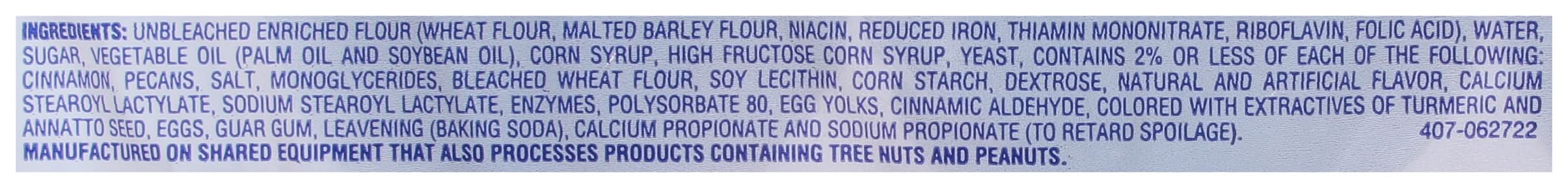 Ingredients: Unbleached Enriched Flour (Wheat Flour, Malted Barley Flour, Niacin, Reduced Iron, Thiamin Mononitrate, Riboflavin, Folic Acid), Water, Sugar, Vegetable Oil (Palm Oil and Soybean Oil), Corn Syrup, High Fructose Corn Syrup, Yeast, Contains 2% or Less of Each of the Following: Cinnamon, Pecans, Salt, Monoglycerides, Bleached Wheat Flour, Soy Lecithin, Corn Starch, Dextrose, Natural and Artificial Flavor, Calcium Stearoyl Lactylate, Sodium Stearoyl Lactylate, Enzymes, Polysorbate 80, Egg Yolks, Cinnamic Aldehyde, Colored with Extractives of Turmeric and Annatto Seed, Eggs, Guar Gum, Leavening (Baking Soda), Calcium Propionate and Sodium Propionate (to Retard Spoilage) Contains: Wheat, Barley, Soybeans, Corn, Tree Nuts, Pecans, Eggs, Tree Nuts, Peanuts