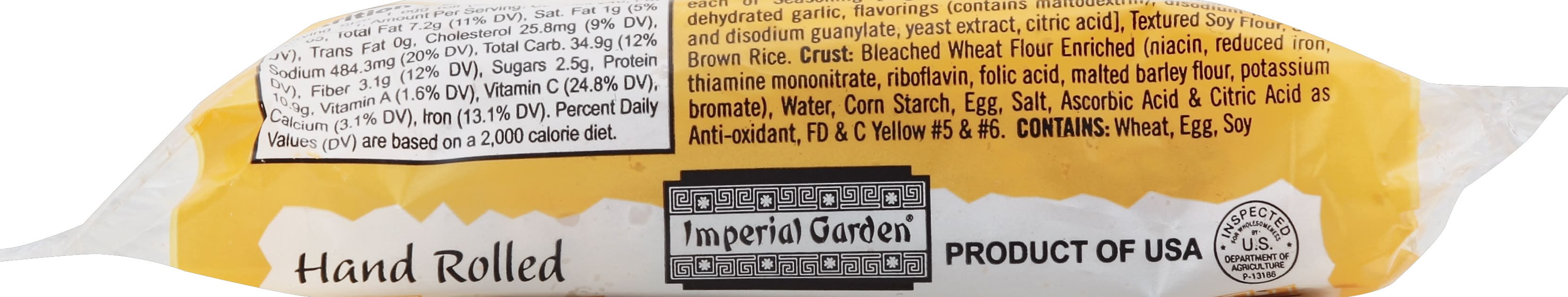 Ingredients: Filling: Cabbage, Chicken, Carrot, Onion, Celery, Sugar, Vegetable Oil, Sesame Flavored Oil (Soy Bean Oil, Sesame Oil), and No More than 2% of Each of Seasoning (Sugar, Salt, Spices, Monoammonium Glutamate, Dehydrated Garlic, Flavorings [Contains Maltodextrin], Disodium Inosinate and Disodium Guanylate, Yeast Extract, Citric Acid), Textured Soy Flour, Salt, Brown Rice. Crust: Bleached Wheat Flour Enriched (Niacin, Reduced Iron, Thiamine Mononitrate, Riboflavin, Folic Acid, Malted Barley Flour, Potassium Bromate), Water, Corn Starch, Egg, Salt, Ascorbic Acid & Citric Acid as Anti-Oxidant, FD&C Yellow 5 & 6 Contains: Eggs, Soybeans, Wheat