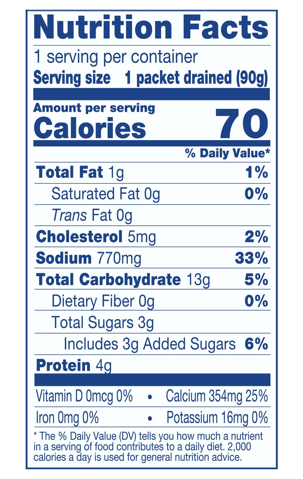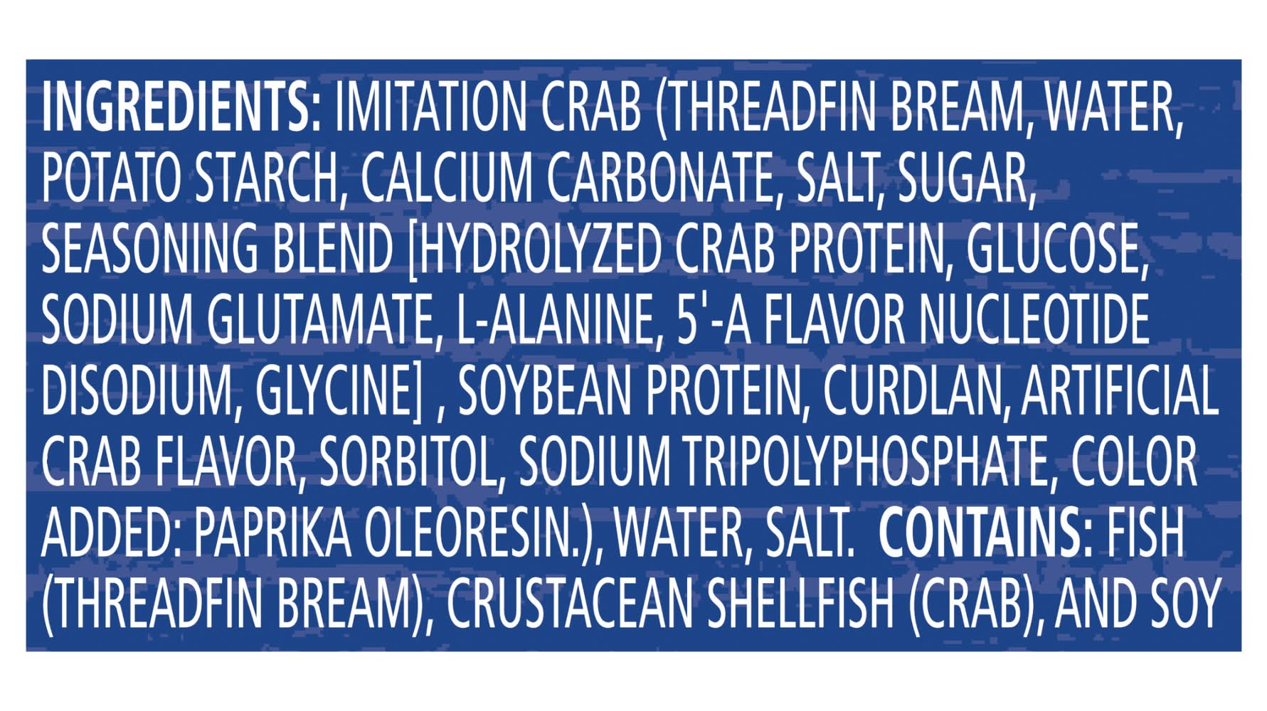 Ingredients: Imitation Crab (Threadfin Bream, Water, Potato Starch, Calcium Carbonate, Salt, Sugar, Seasoning Blend [Hydrolyzed Crab Protein, Glucose, Sodium Glutamate, L-Alanine, 5'-a Flavor Nucleotide Disodium, Glycine], Soybean Protein, Curdlan, Artificial Crab Flavor, Sorbitol, Sodium Tripolyphosphate, Color Added: Paprika Oleoresin, ), Water, Salt Contains: Crustacean Shellfish, Crab, Soybeans, Fish, Bream