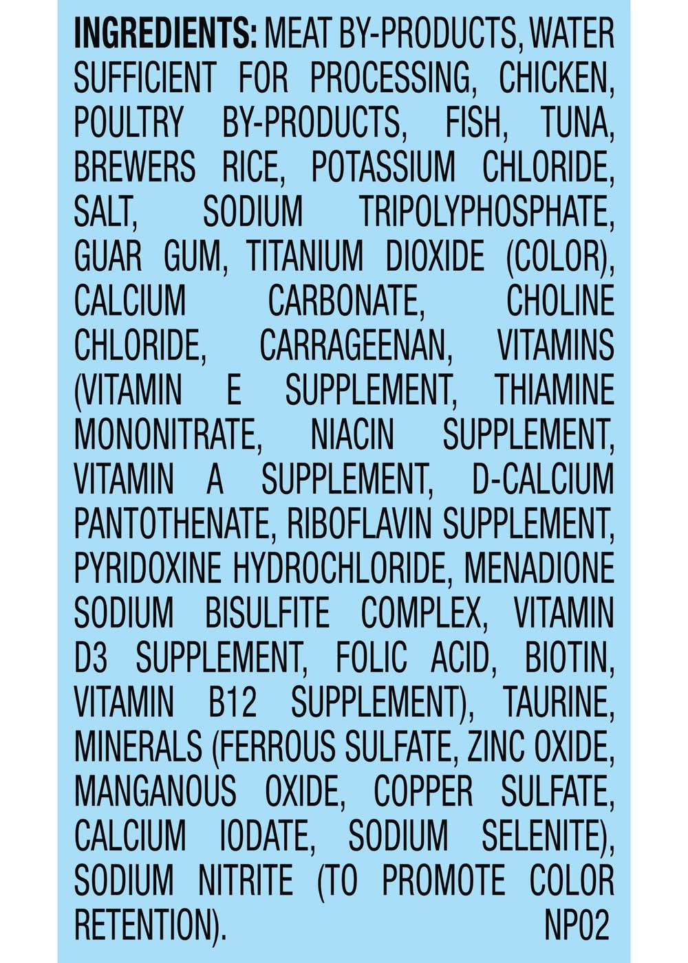 Ingredients: Meat By-products, water Sufficient For Processing, Chicken, Poultry By-products, Fish, Tuna, Brewers Rice, Potassium Chloride, Salt, Sodium Tripolyphosphate, Guar Gum, Titanium Dioxide (color), Calcium Carbonate, Choline Chloride, Carrageenan, Vitamins (vitamin E Supplement, Thiamine Mononitrate, Niacin Supplement, Vitamin A Supplement, D-calcium Pantothenate, Riboflavin Supplement, Pyridoxine Hydrochloride, Menadione Sodium Bisulfite Complex, Vitamin D3 Supplement, Folic Acid, Biotin, Vitamin B12 Supplement), Taurine, Minerals (ferrous Sulfate, Zinc Oxide, Manganous Oxide, Copper Sulfate, Calcium Iodate, Sodium Selenite), Sodium Nitrite (to Promote Color Retention).