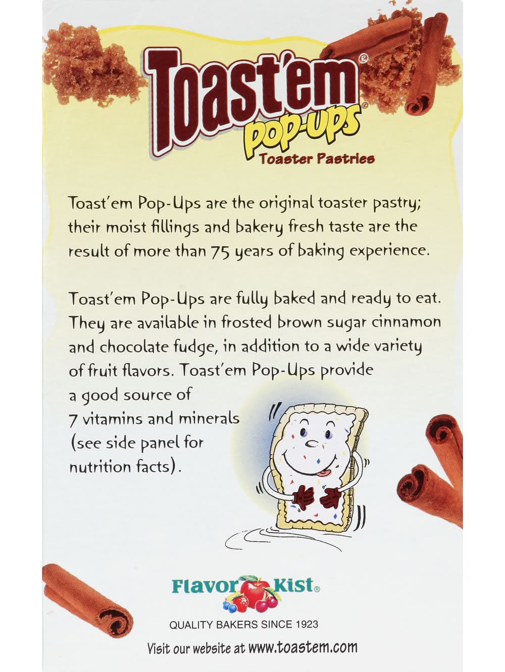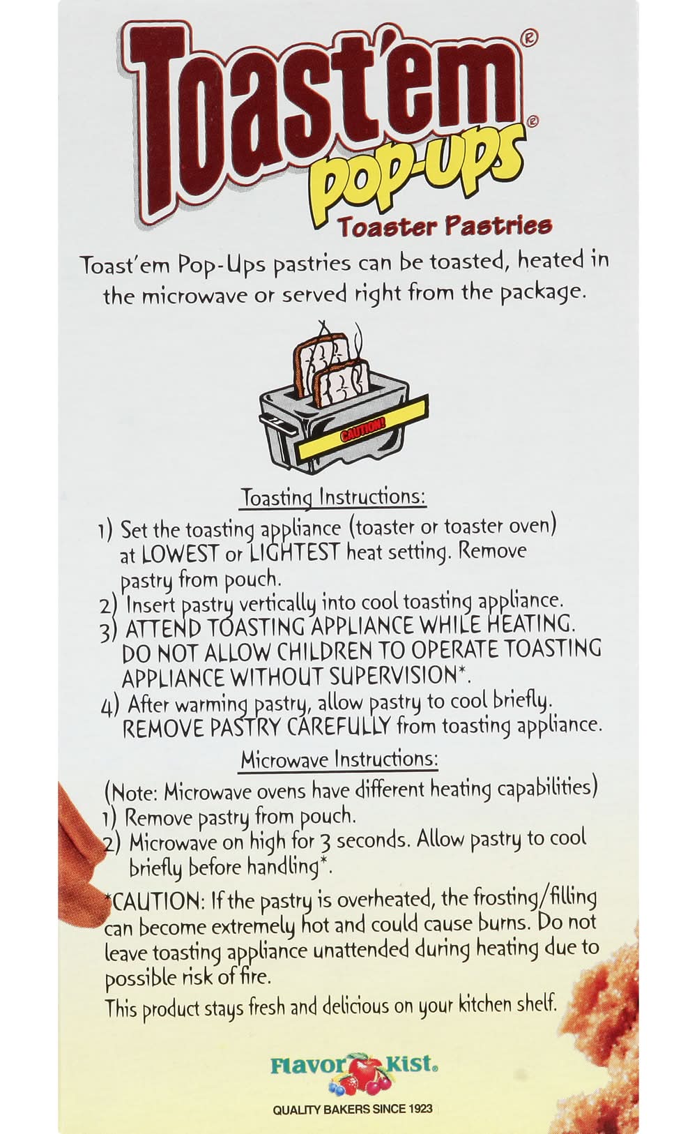 Toast’ em pop-ups pastries can be toasted, heated in the microwave or served right from the package. toasting instructions: 1) set the toasting appliance (toaster or toaster oven) at lowest or lightest heat setting. remove pastry from pouch. 2) insert pastry vertically into cool toasting appliance. 3) attend toasting appliance while heating. do not allow children to operate toasting appliance without supervision (caution: if the pastry is overheated, the frosting/filling can become extremely hot and could cause burns. do not leave toasting appliance unattended during heating due to possible risk of fire.). 4) after warming pastry, allow pastry to cool briefly. remove pastry carefully from toasting appliance. microwave instructions: (note: microwave ovens have different heating capabilities) 1) remove pastry from pouch. 2) microwave on high for 3 seconds. allow pastry to cool briefly before handling (caution: if the pastry is overheated, the frosting/filling can become extremely hot and could cause burns. do not leave toasting appliance unattended during heating due to possible risk of fire). this product stays fresh and delicious on your kitchen shelf.