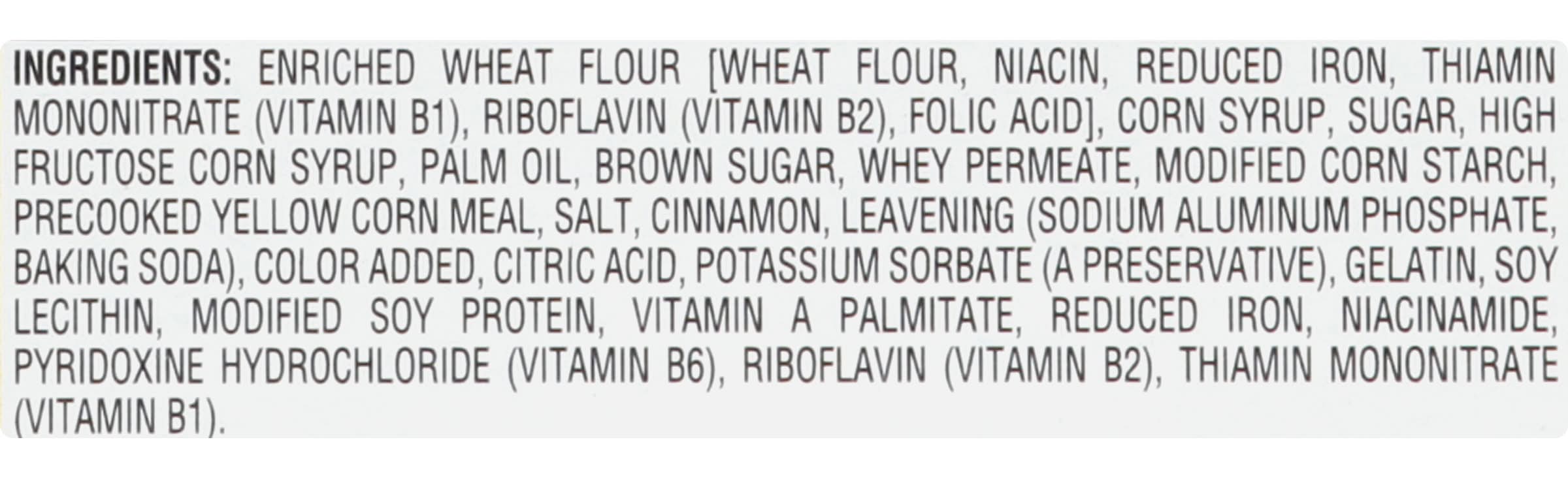 Ingredients: Enriched Wheat Flour [Wheat Flour, Niacin, Reduced Iron, Thiamin Mononitrate (Vitamin B1), Riboflavin (Vitamin B2), Folic Acid], Corn Syrup, Sugar, High Fructose Corn Syrup, Palm Oil, Brown Sugar, Whey Permeate, Modified Corn Starch, Precooked Yellow Corn Meal, Salt, Cinnamon, Leavening (Sodium Aluminum Phosphate, Baking Soda), Color Added, Citric Acid, Potassium Sorbate (a Preservative), Gelatin, Soy Lecithin, Modified Soy Protein, Vitamin A Palmitate, Reduced Iron, Niacinamide, Pyridoxine Hydrochloride (Vitamin B6), Riboflavin (Vitamin B2), Thiamin Mononitrate (Vitamin B1) Contains: Wheat, Milk, Soybeans, Peanuts, Tree Nuts