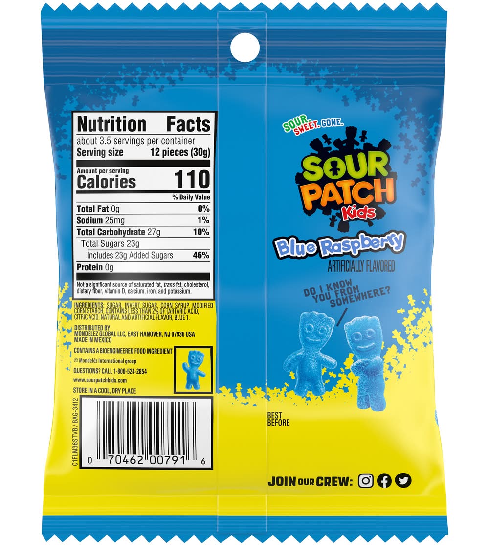 The Nationwide Winning Color, Blue Sour Patch Kids Candy, Is a Wholly Delicious, Sweet Treat That's Sour. Sweet. Gone. Add a Little Fun to Your Candy Experience With the Unique Kid Shapes That Give These Candies Their Name. a Fat Free Food, This Soft Candy Makes a Great Sour Then Sweet Treat for Multiple Occasions. Keep Sour Patch Kids Sour Gummy Snacks On-hand for Upcoming Celebrations Like Halloween, Valentine's Day or Birthdays. This Bagged Candy Also Makes a Great Movie Theater Candy to Snack on During Your Favorite Flick. Flavor: Blue raspberry