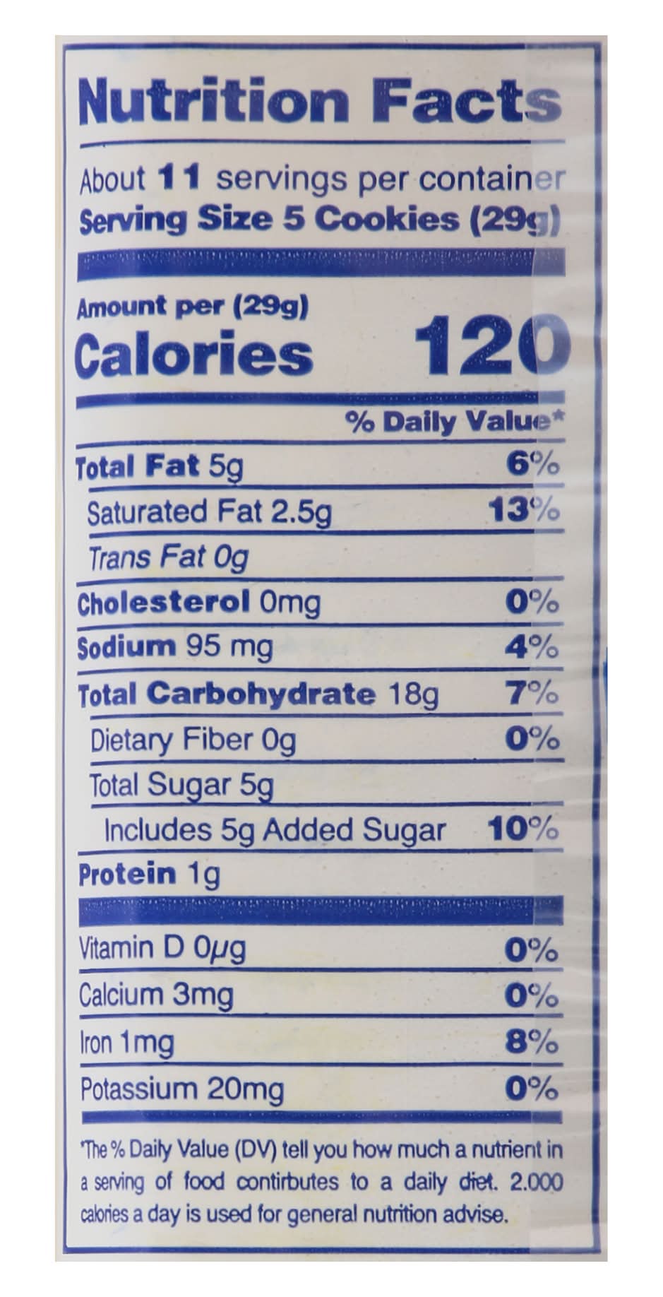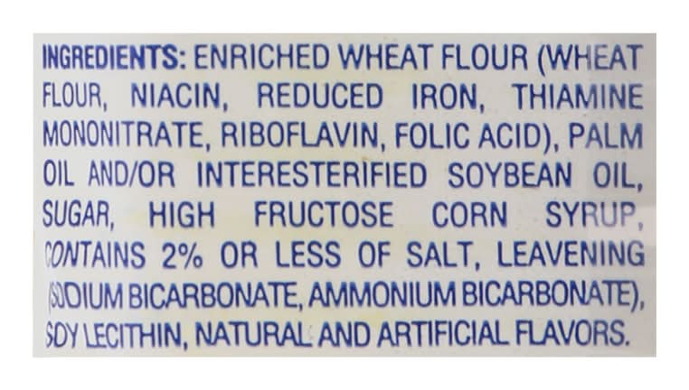 Ingredients: Enriched Wheat Flour (Wheat Flour, Niacin, Reduced Iron, Thiamine Mononitrate, Riboflavin, Folic Acid), Palm Oil, and/or Interesterified Soybean Oil, Sugar, High Fructose Corn Syrup, Contains 2% or Less of Salt, Leavening Sodium Bicarbonate, Ammonium Bicarbonate), Soy Lecithin, Natural and Artificial Flavors Contains: Wheat, Soybeans, Peanuts, Milk, Tree Nuts